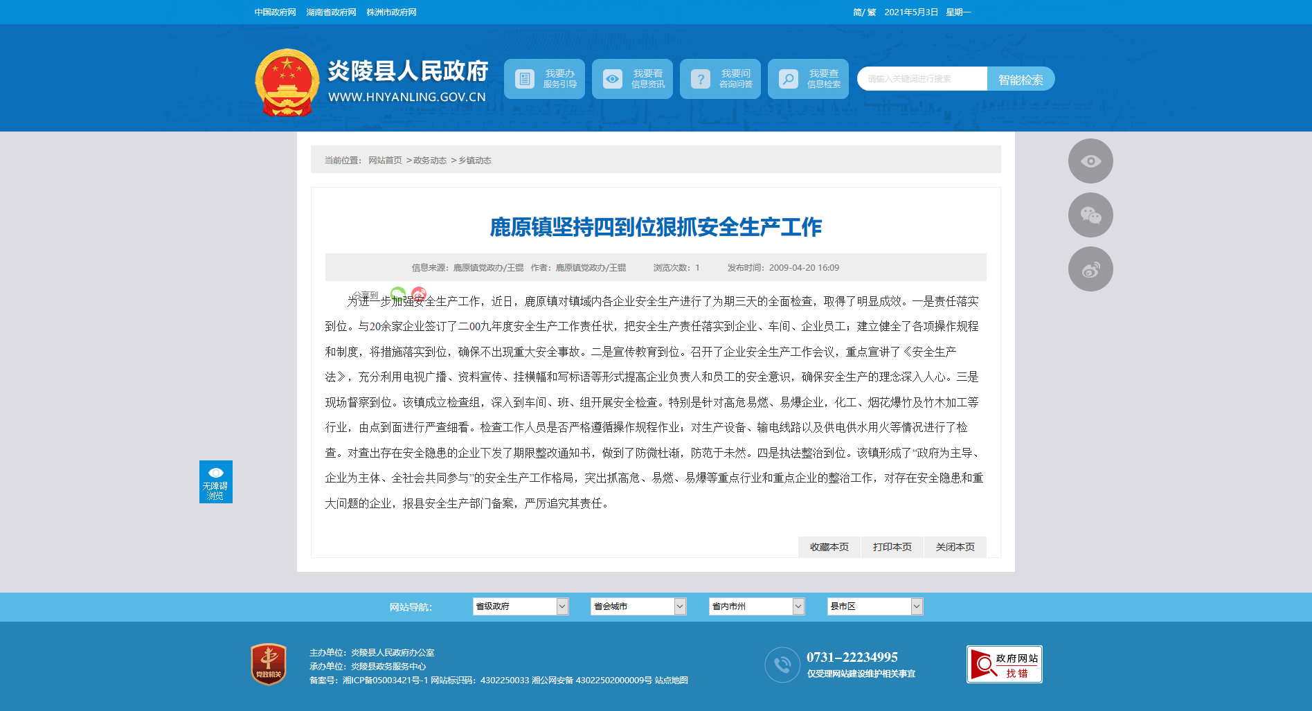 为进一步加强安全生产工作,近日,鹿原镇对镇域内各企业安全生产进行了为期三天的全面检查,取得了明显成效。一是责任落实到位。与20余家企业签订了二00九年度安全生产工作责任状,把安全生产责任落实到企业、车间、企业员工;建立健全了各项操作规程和制度,将措施落实到位,确保不出现重大安全事故。二是宣传教育到位。召开了企业安全生产工作会议,重点宣讲了《安全生产法》,充分利用电视广播、资料宣传、挂横幅和写标语等形式提高企业负责人和员工的安全意识,确保安全生产的理念深入人心。三是现场督察到位。该镇成立检查组,深入到车间、班、组开展安全检查。特别是针对高危易燃、易爆企业,化工、烟花爆竹及竹木加工等行业,由点到面进行严查细看。检查工作人员是否严格遵循操作规程作业;对生产设备、输电线路以及供电供水用火等情况进行了检查。对查出存在安全隐患的企业下发了期限整改通知书,做到了防微杜渐,防范于未然。四是执法整治到位。该镇形成了“政府为主导、企业为主体、全社会共同参与”的安全生产工作格局,突出抓高危、易燃、易爆等重点行业和重点企业的整治工作,对存在安全隐患和重大问题的企业,报县安全生产部门备案,严厉追究其责任。