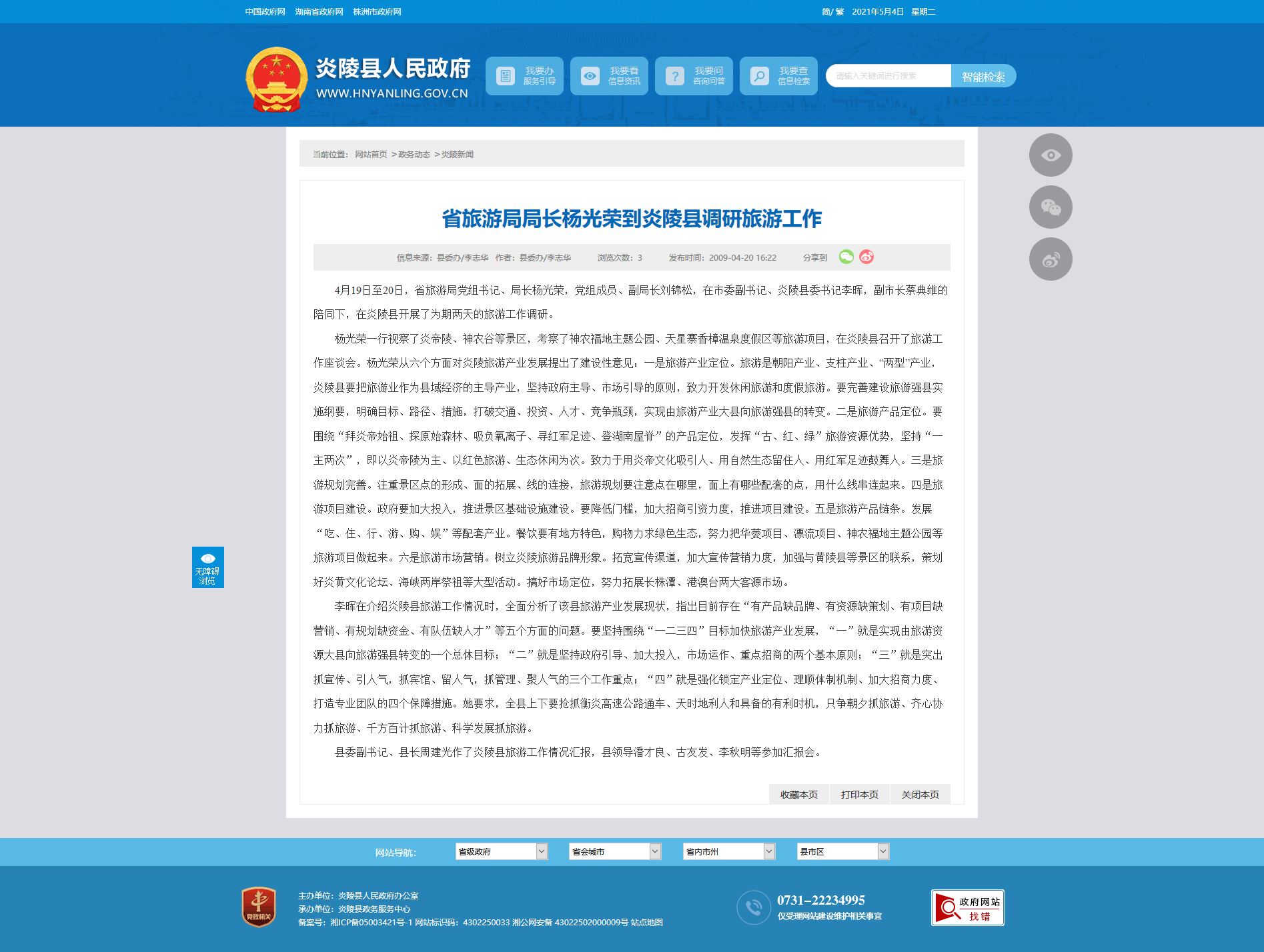 李晖在介绍炎陵县旅游工作情况时,全面分析了该县旅游产业发展现状,指出目前存在“有产品缺品牌、有资源缺策划、有项目缺营销、有规划缺资金、有队伍缺人才”等五个方面的问题。要坚持围绕“一二三四”目标加快旅游产业发展,“一”就是实现由旅游资源大县向旅游强县转变的一个总体目标;“二”就是坚持政府引导、加大投入,市场运作、重点招商的两个基本原则;“三”就是突出抓宣传、引人气,抓宾馆、留人气,抓管理、聚人气的三个工作重点;“四”就是强化锁定产业定位、理顺体制机制、加大招商力度、打造专业团队的四个保障措施。她要求,全县上下要抢抓衡炎高速公路通车、天时地利人和具备的有利时机,只争朝夕抓旅游、齐心协力抓旅游、千方百计抓旅游、科学发展抓旅游。