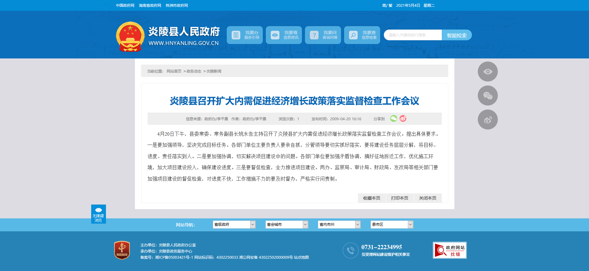 4月20日下午,县委常委、常务副县长姚永告主持召开了炎陵县扩大内需促进经济增长政策落实监督检查工作会议。提出具体要求。一是要加强领导,坚决完成目标任务。各部门单位主要负责人要亲自抓,分管领导要切实抓好落实,要将建设任务层层分解,将目标、进度、责任落实到人。二是要加强协调,切实解决项目建设中的问题。各部门单位要加强矛盾协调,搞好征地拆迁工作,优化施工环境,加大项目建设投入,确保建设进度。三是要督促检查,全力推进项目建设。两办、监察局、审计局、财政局、发改局等相关部门要加强项目建设的督促检查,对进度不快,工作措施不力的要及时督办,严格实行问责制。