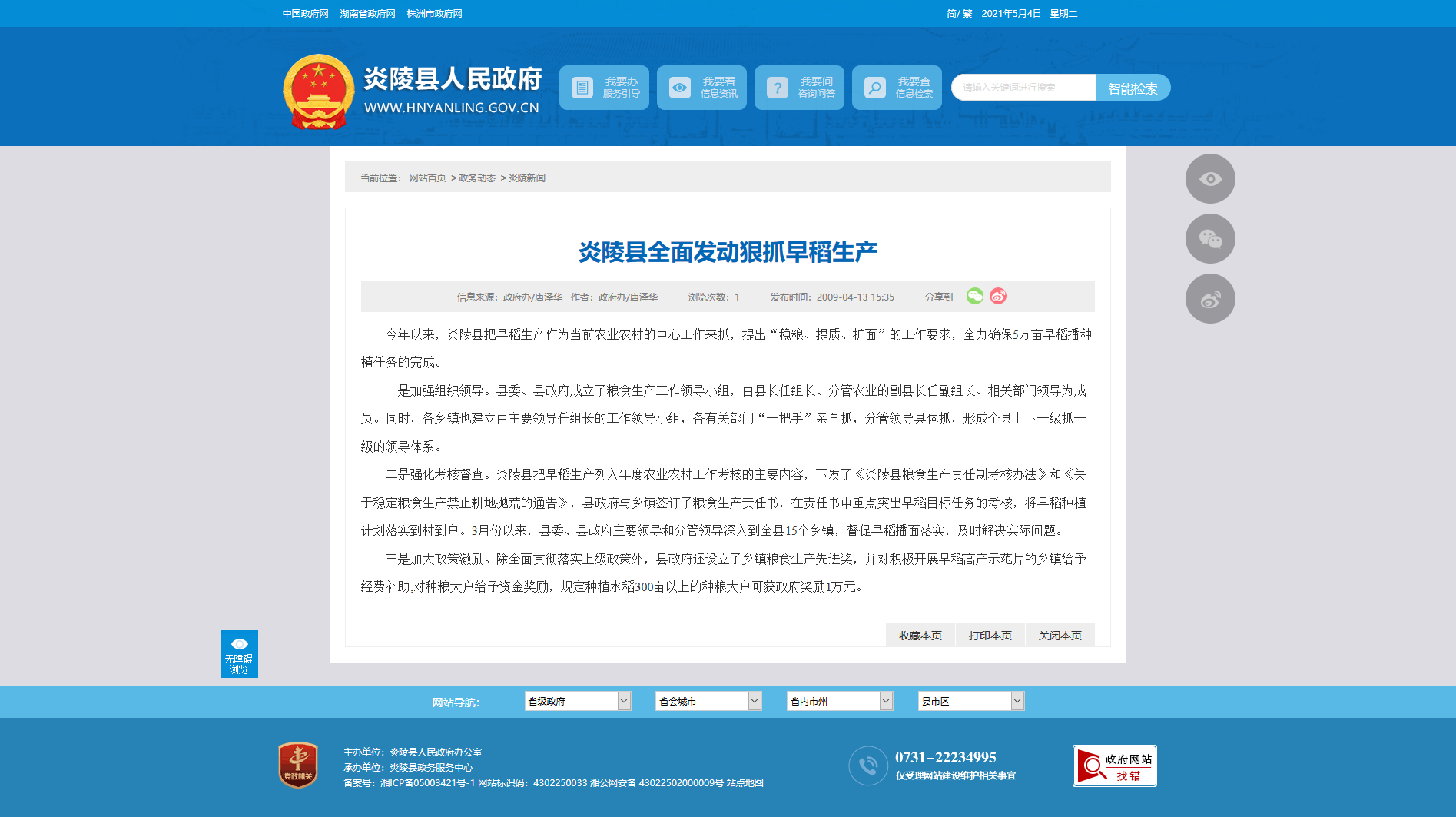 二是强化考核督查。炎陵县把早稻生产列入年度农业农村工作考核的主要内容,下发了《炎陵县粮食生产责任制考核办法》和《关于稳定粮食生产禁止耕地抛荒的通告》,县政府与乡镇签订了粮食生产责任书,在责任书中重点突出早稻目标任务的考核,将早稻种植计划落实到村到户。3月份以来,县委、县政府主要领导和分管领导深入到全县15个乡镇,督促早稻播面落实,及时解决实际问题。