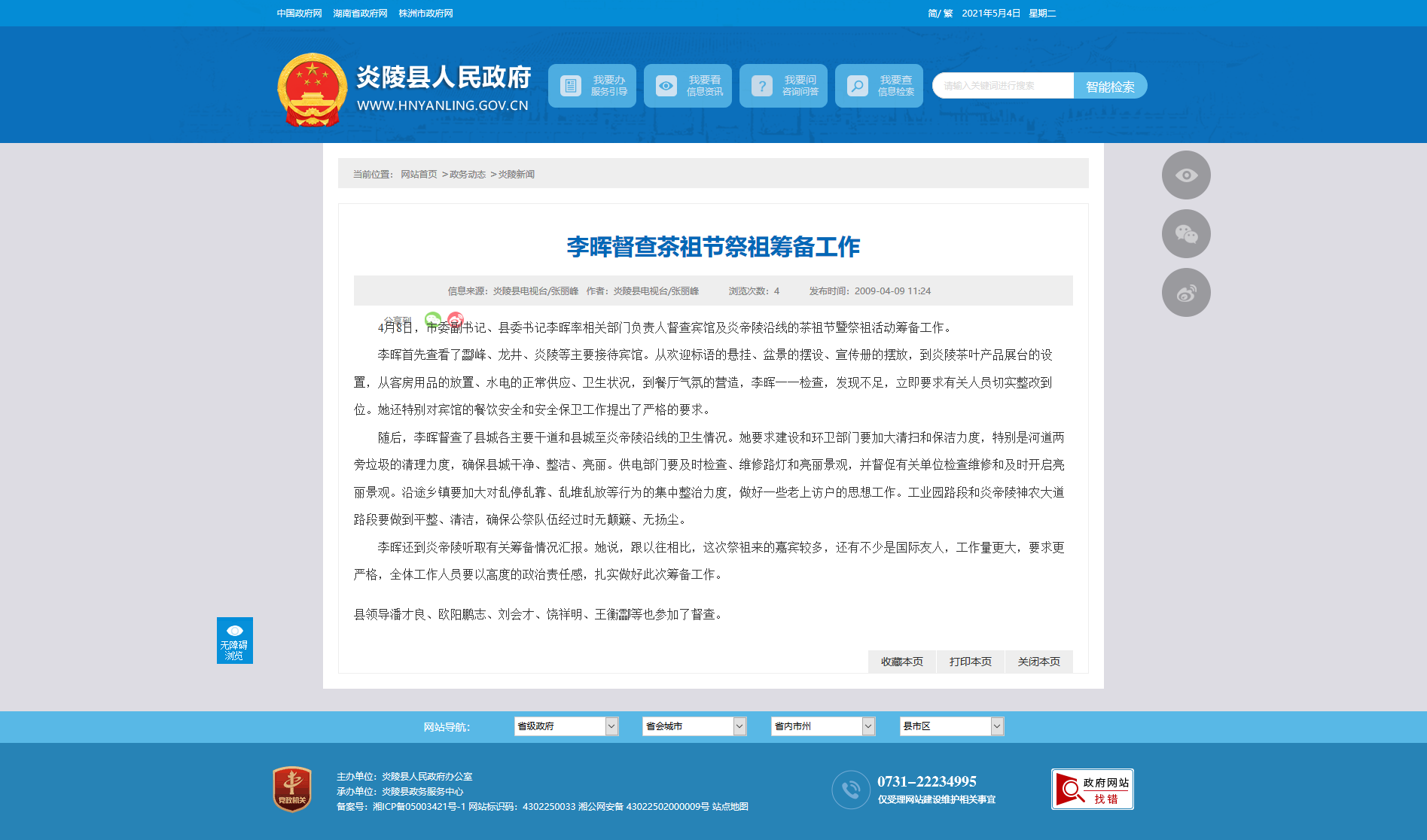 4月8日,市委副书记、县委书记李晖率相关部门负责人督查宾馆及炎帝陵沿线的茶祖节暨祭祖活动筹备工作。