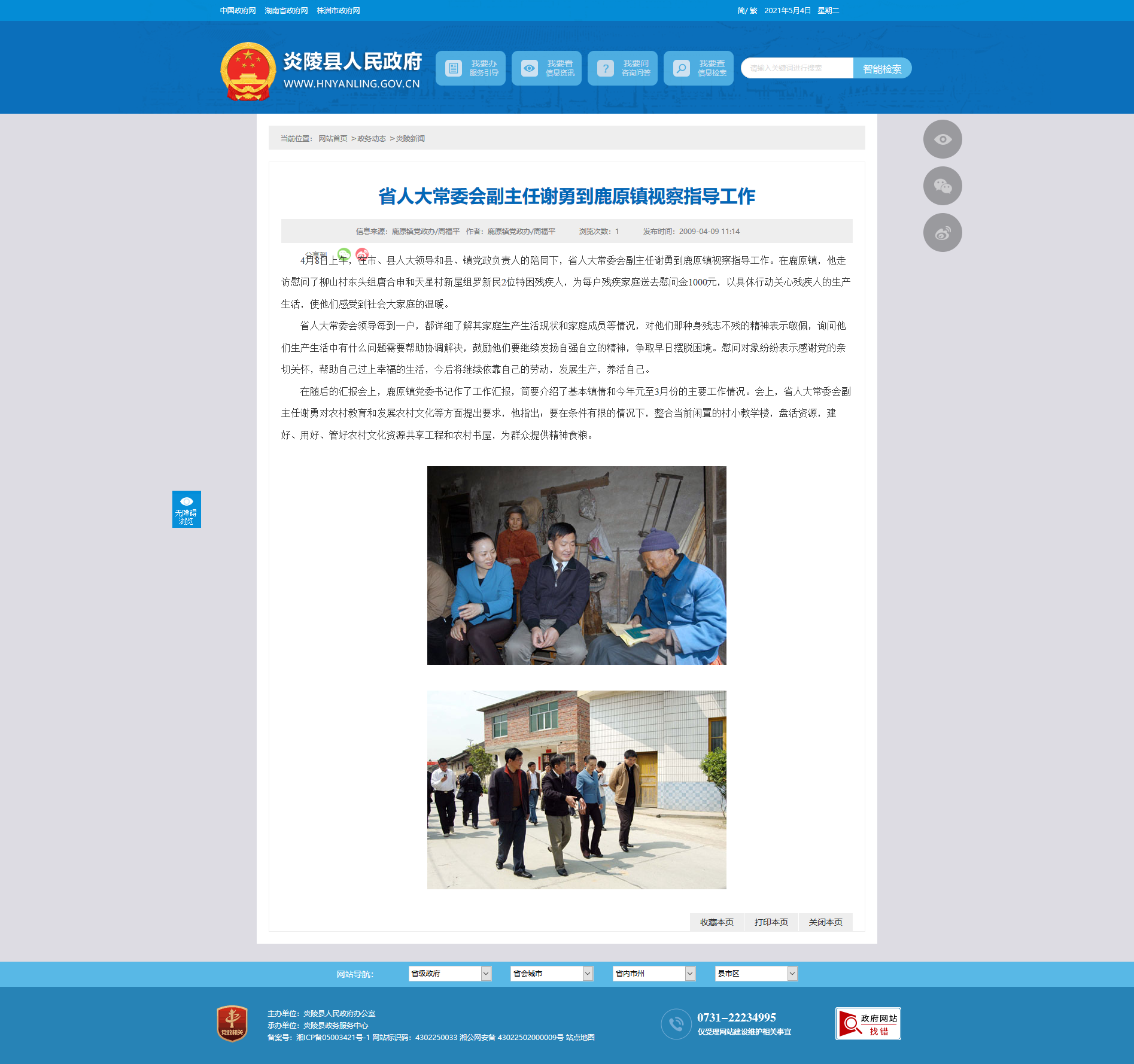 4月8日上午,在市、县人大领导和县、镇党政负责人的陪同下,省人大常委会副主任谢勇到鹿原镇视察指导工作。在鹿原镇,他走访慰问了柳山村东头组唐合申和天星村新屋组罗新民2位特困残疾人,为每户残疾家庭送去慰问金1000元,以具体行动关心残疾人的生产生活,使他们感受到社会大家庭的温暖。