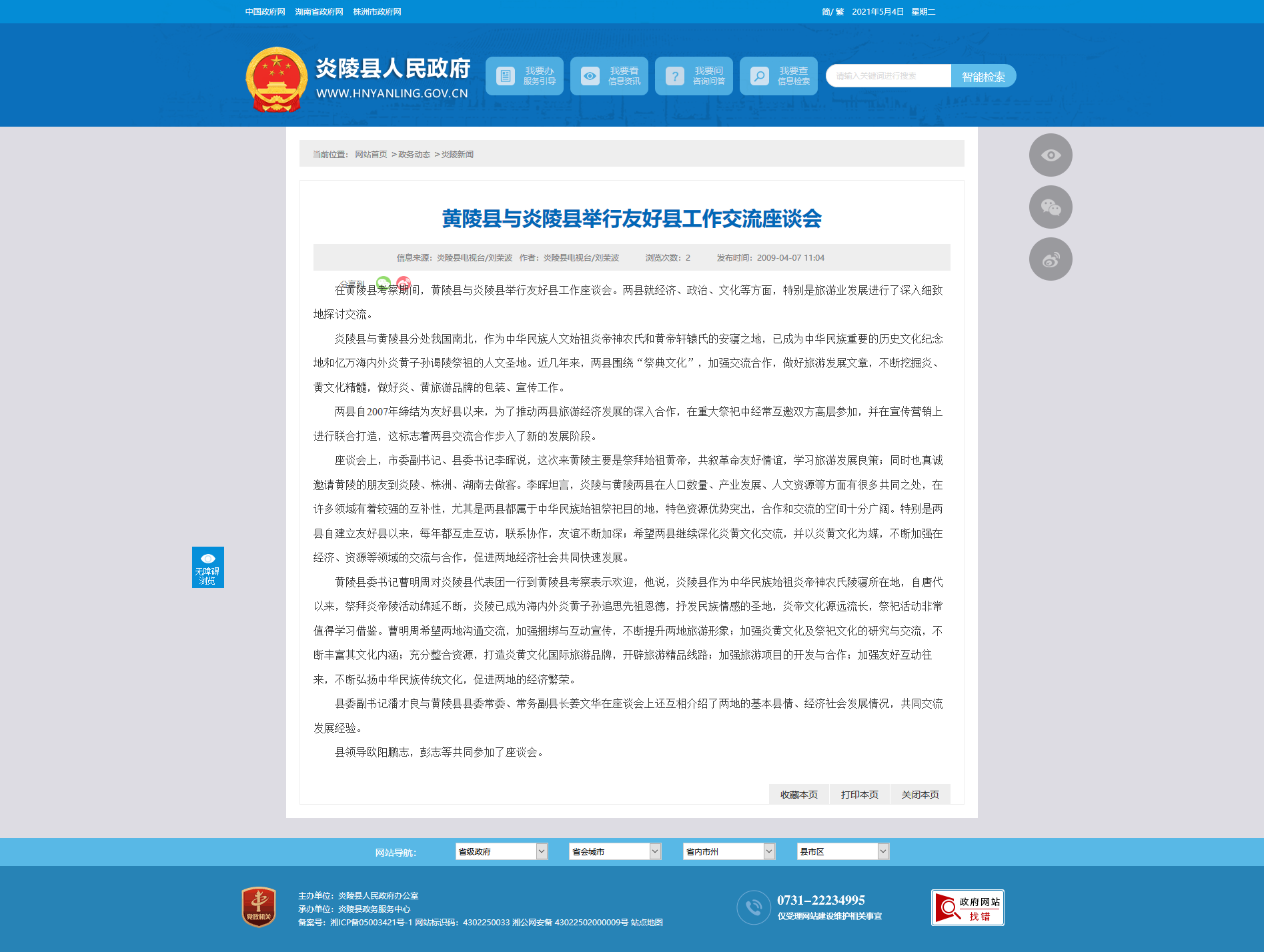在黄陵县考察期间,黄陵县与炎陵县举行友好县工作座谈会。两县就经济、政治、文化等方面,特别是旅游业发展进行了深入细致地探讨交流。