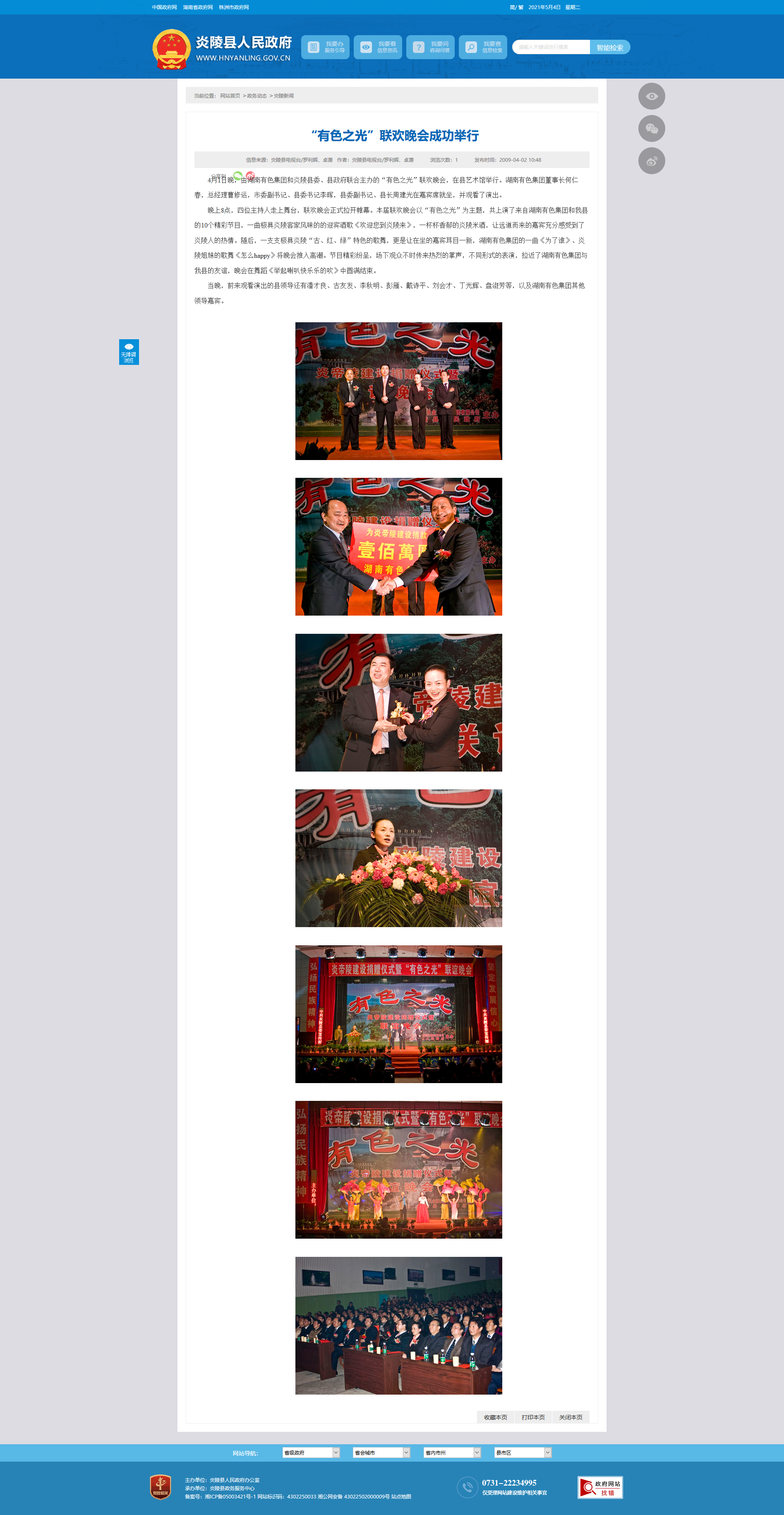 4月1日晚,由湖南有色集团和炎陵县委、县政府联合主办的“有色之光”联欢晚会,在县艺术馆举行。湖南有色集团董事长何仁春,总经理曹修运,市委副书记、县委书记李晖,县委副书记、县长周建光在嘉宾席就坐,并观看了演出。