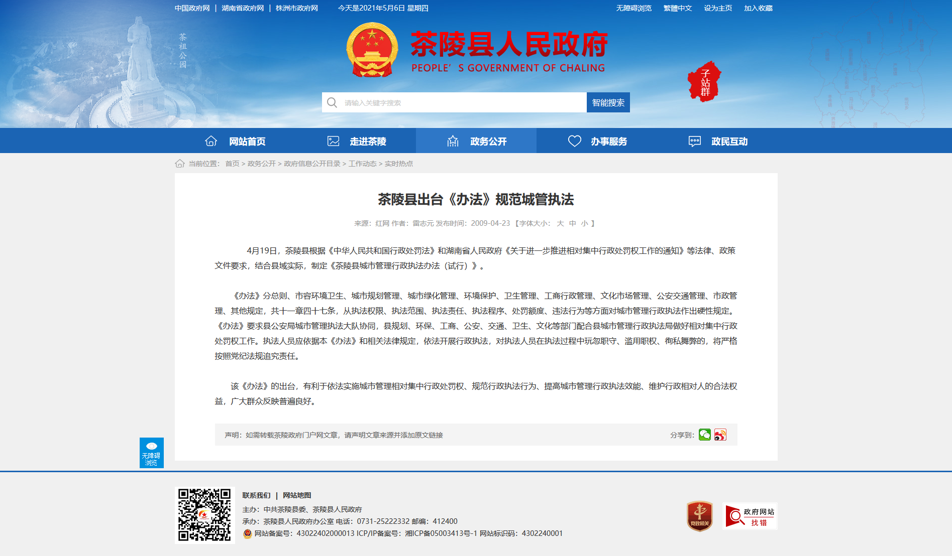 4月19日,茶陵县根据《中华人民共和国行政处罚法》和湖南省人民政府《关于进一步推进相对集中行政处罚权工作的通知》等法律、政策文件要求,结合县域实际,制定《茶陵县城市管理行政执法办法(试行)》。