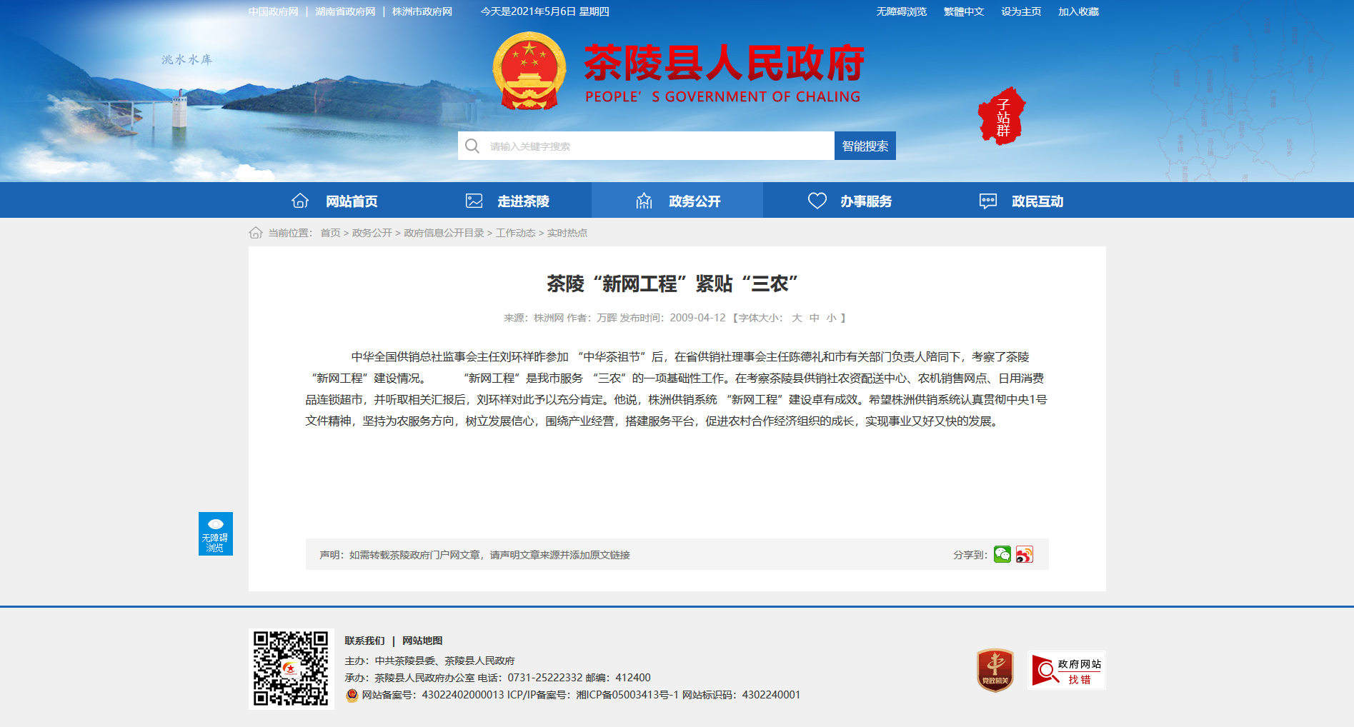 中华全国供销总社监事会主任刘环祥昨参加 “中华茶祖节”后,在省供销社理事会主任陈德礼和市有关部门负责人陪同下,考察了茶陵 “新网工程”建设情况。 “新网工程”是我市服务 “三农”的一项基础性工作。在考察茶陵县供销社农资配送中心、农机销售网点、日用消费品连锁超市,并听取相关汇报后,刘环祥对此予以充分肯定。他说,株洲供销系统 “新网工程”建设卓有成效。希望株洲供销系统认真贯彻中央1号文件精神,坚持为农服务方向,树立发展信心,围绕产业经营,搭建服务平台,促进农村合作经济组织的成长,实现事业又好又快的发展。