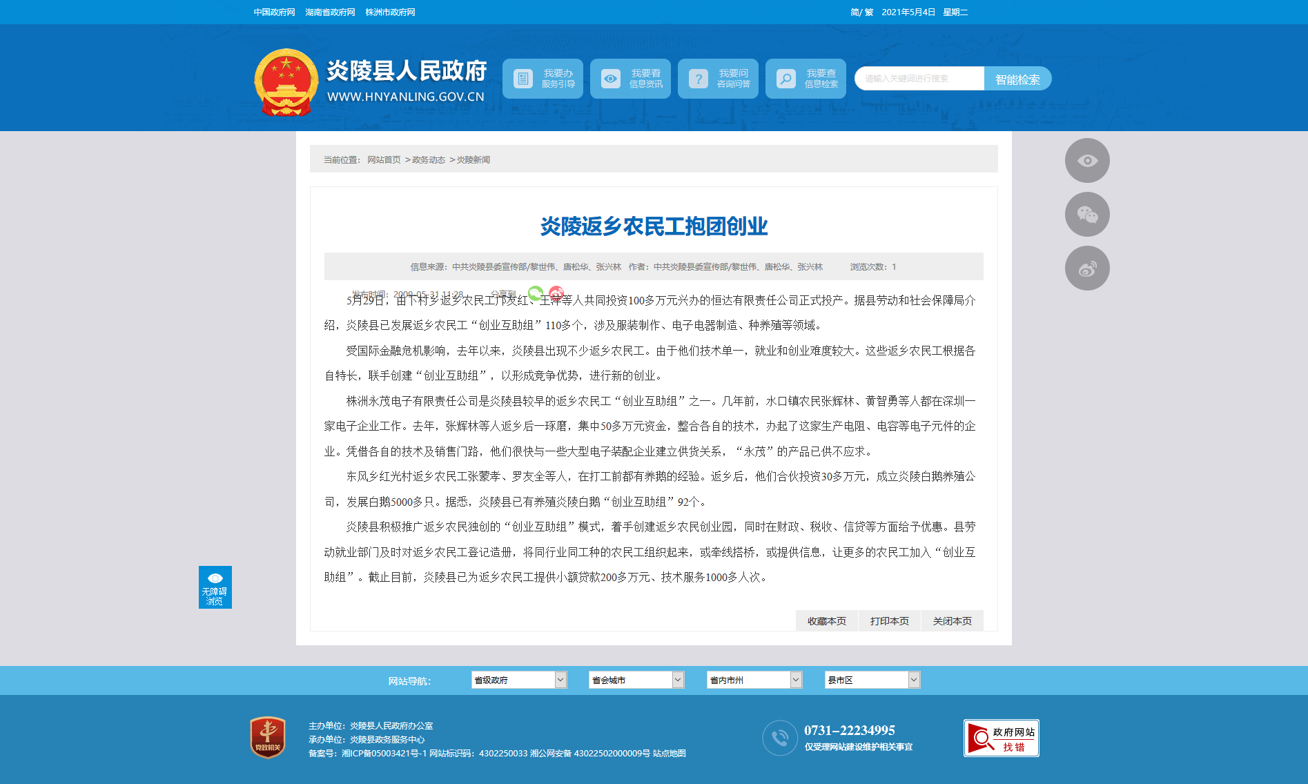 炎陵县积极推广返乡农民独创的“创业互助组”模式,着手创建返乡农民创业园,同时在财政、税收、信贷等方面给予优惠。县劳动就业部门及时对返乡农民工登记造册,将同行业同工种的农民工组织起来,或牵线搭桥,或提供信息,让更多的农民工加入“创业互助组”。截止目前,炎陵县已为返乡农民工提供小额贷款200多万元、技术服务1000多人次。
