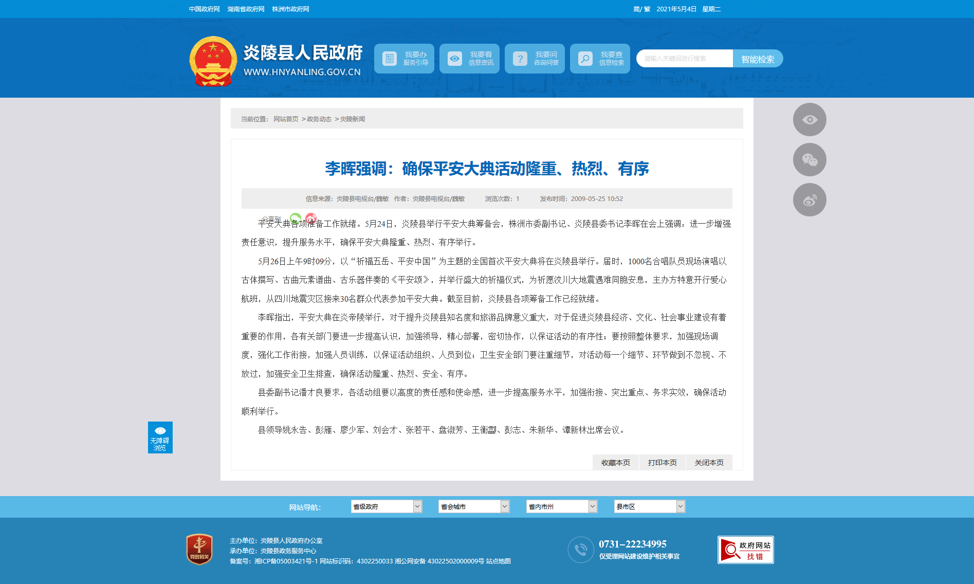 平安大典各项准备工作就绪。5月24日,炎陵县举行平安大典筹备会,株洲市委副书记、炎陵县委书记李晖在会上强调:进一步增强责任意识,提升服务水平,确保平安大典隆重、热烈、有序举行。