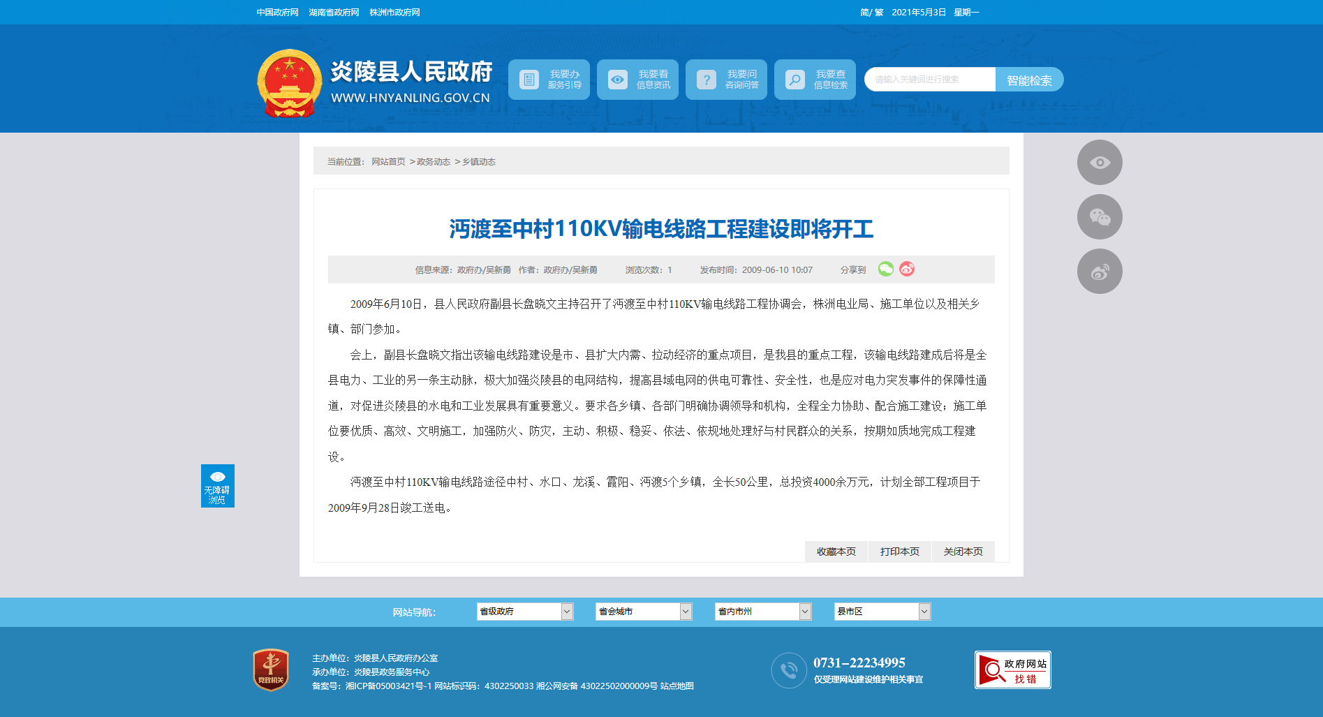 会上,副县长盘晓文指出该输电线路建设是市、县扩大内需、拉动经济的重点项目,是我县的重点工程,该输电线路建成后将是全县电力、工业的另一条主动脉,极大加强炎陵县的电网结构,提高县域电网的供电可靠性、安全性,也是应对电力突发事件的保障性通道,对促进炎陵县的水电和工业发展具有重要意义。要求各乡镇、各部门明确协调领导和机构,全程全力协助、配合施工建设;施工单位要优质、高效、文明施工,加强防火、防灾,主动、积极、稳妥、依法、依规地处理好与村民群众的关系,按期如质地完成工程建设。