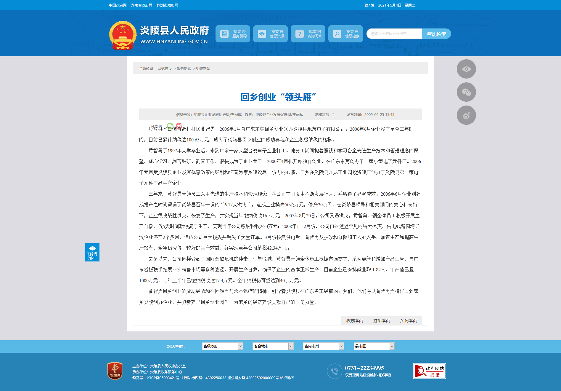 炎陵县水口镇自源村村民黄智勇,2006年1月自广东东莞回乡创业兴办炎陵县永茂电子有限公司。2006年6月企业投产至今三年时间,目前已累计纳税达100.65万元,成为了炎陵县回乡创业的成功典范和企业积极纳税的楷模。