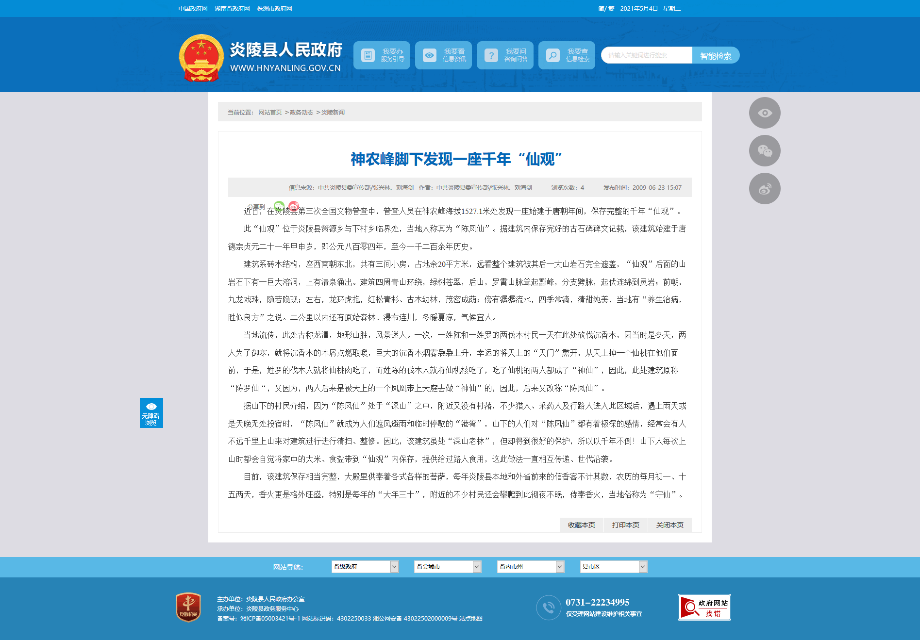 此“仙观”位于炎陵县策源乡与下村乡临界处,当地人称其为“陈凤仙”。据建筑内保存完好的古石碑碑文记载,该建筑始建于唐德宗贞元二十一年甲申岁,即公元八百零四年,至今一千二百余年历史。