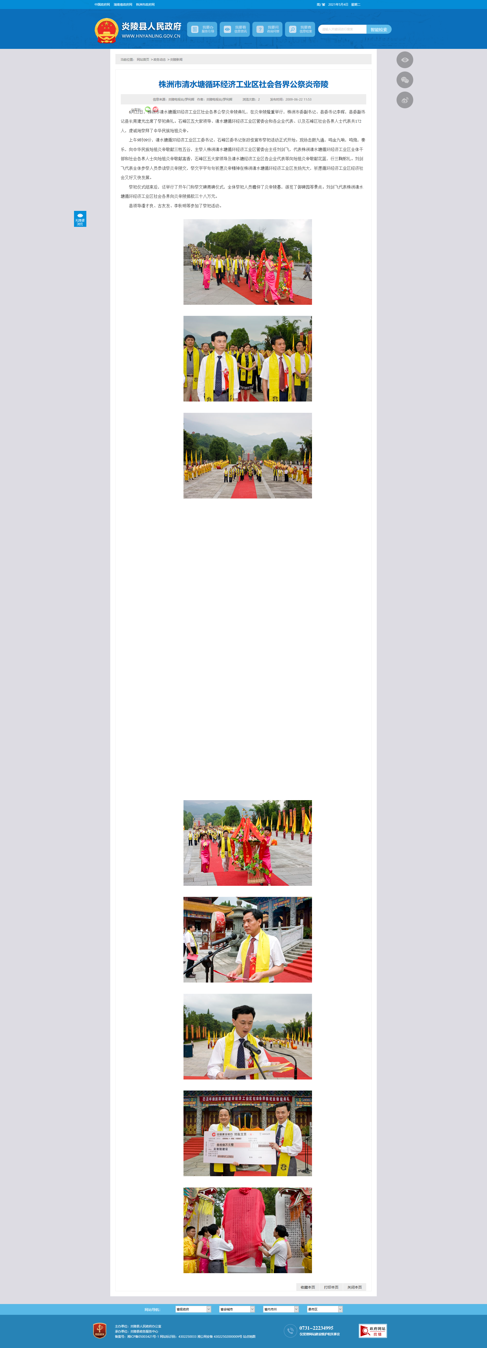 6月22日,株洲市清水塘循环经济工业区社会各界公祭炎帝陵典礼,在炎帝陵隆重举行,株洲市委副书记、县委书记李晖,县委副书记县长周建光出席了祭祀典礼。石峰区五大家领导、清水塘循环经济工业区管委会和各企业代表、以及石峰区社会各界人士代表共172人,虔诚地祭拜了中华民族始祖炎帝。
