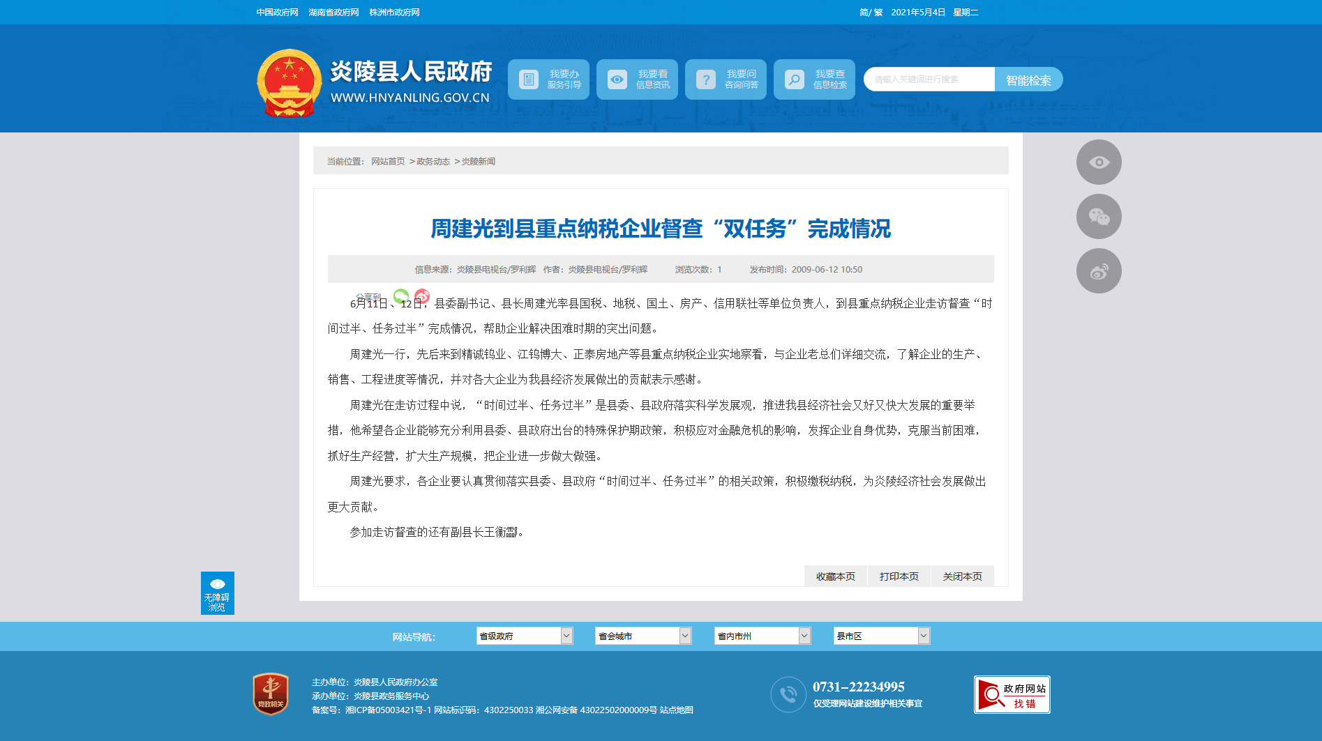 6月11日、12日,县委副书记、县长周建光率县国税、地税、国土、房产、信用联社等单位负责人,到县重点纳税企业走访督查“时间过半、任务过半”完成情况,帮助企业解决困难时期的突出问题。