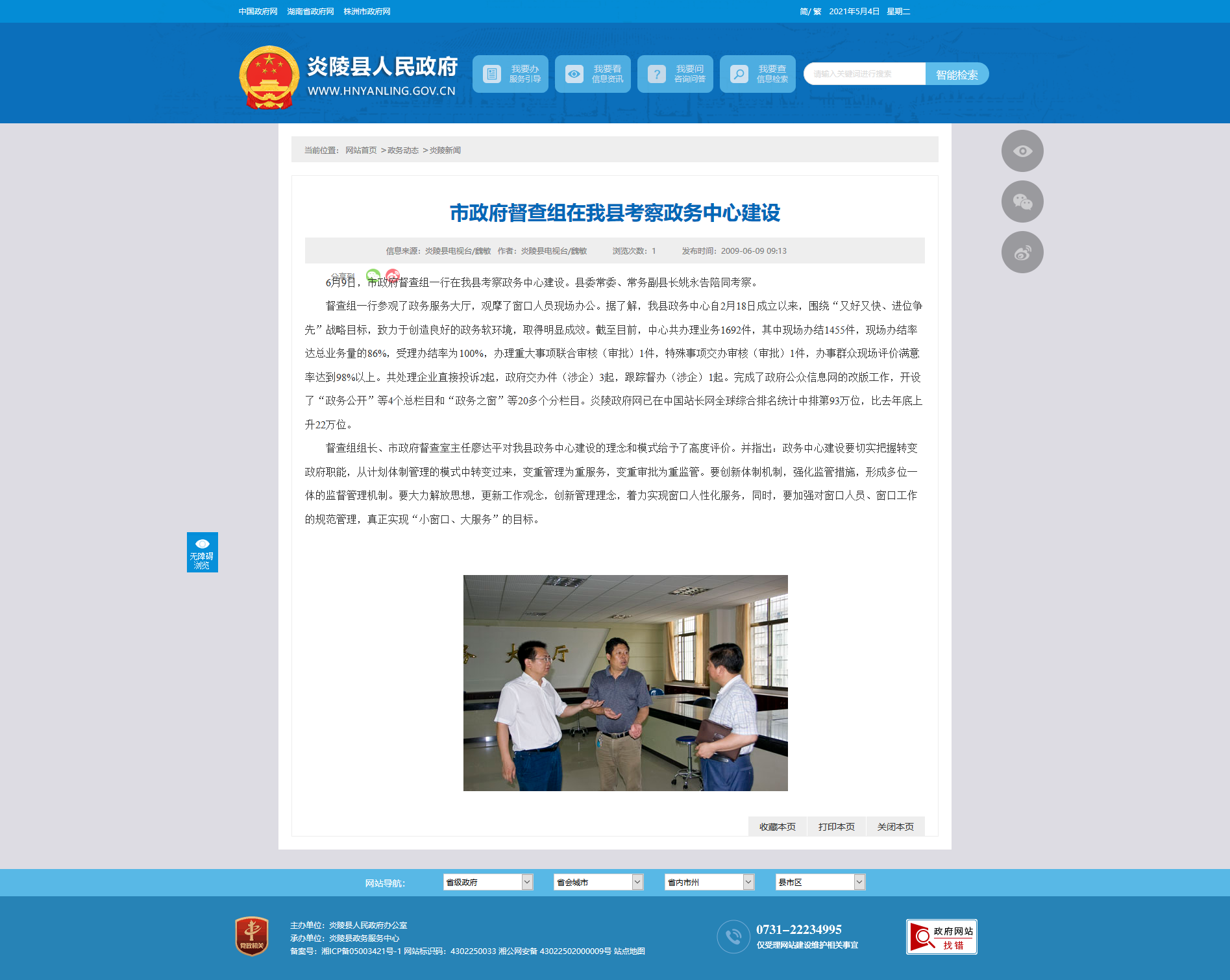 督查组一行参观了政务服务大厅,观摩了窗口人员现场办公。据了解,我县政务中心自2月18日成立以来,围绕“又好又快、进位争先”战略目标,致力于创造良好的政务软环境,取得明显成效。截至目前,中心共办理业务1692件,其中现场办结1455件,现场办结率达总业务量的86%,受理办结率为100%,办理重大事项联合审核(审批)1件,特殊事项交办审核(审批)1件,办事群众现场评价满意率达到98%以上。共处理企业直接投诉2起,政府交办件(涉企)3起,跟踪督办(涉企)1起。完成了政府公众信息网的改版工作,开设了“政务公开”等4个总栏目和“政务之窗”等20多个分栏目。炎陵政府网已在中国站长网全球综合排名统计中排第93万位,比去年底上升22万位。