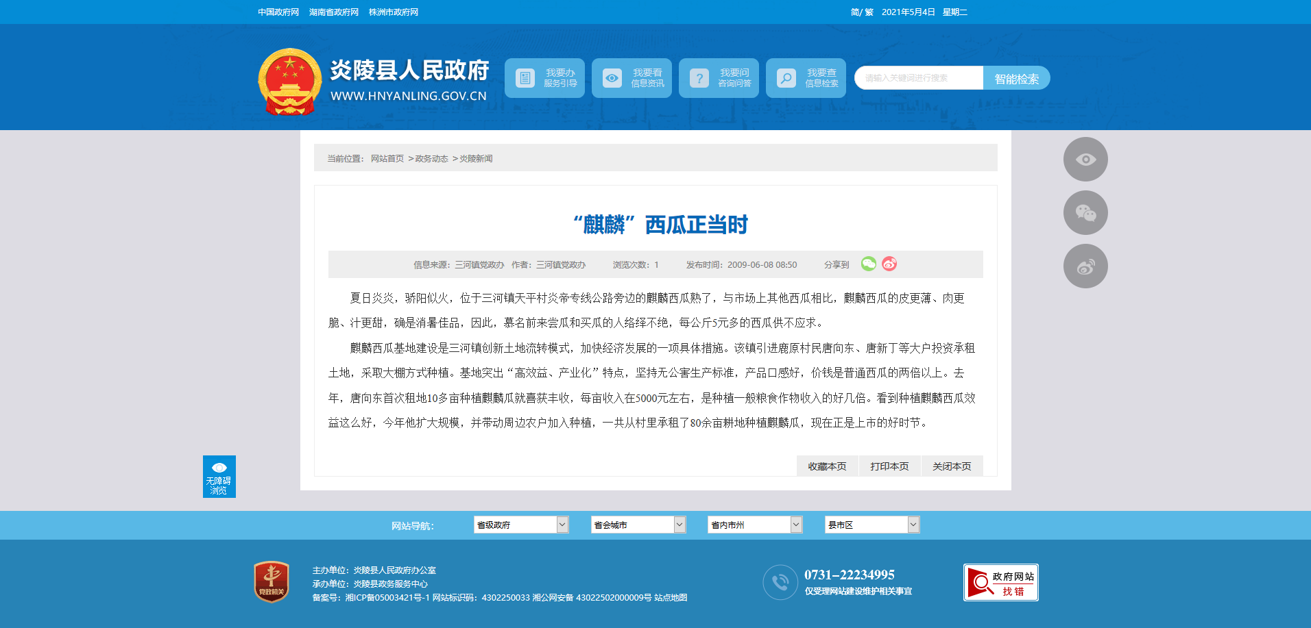 夏日炎炎,骄阳似火,位于三河镇天平村炎帝专线公路旁边的麒麟西瓜熟了,与市场上其他西瓜相比,麒麟西瓜的皮更薄、肉更脆、汁更甜,确是消暑佳品,因此,慕名前来尝瓜和买瓜的人络绎不绝,每公斤5元多的西瓜供不应求。