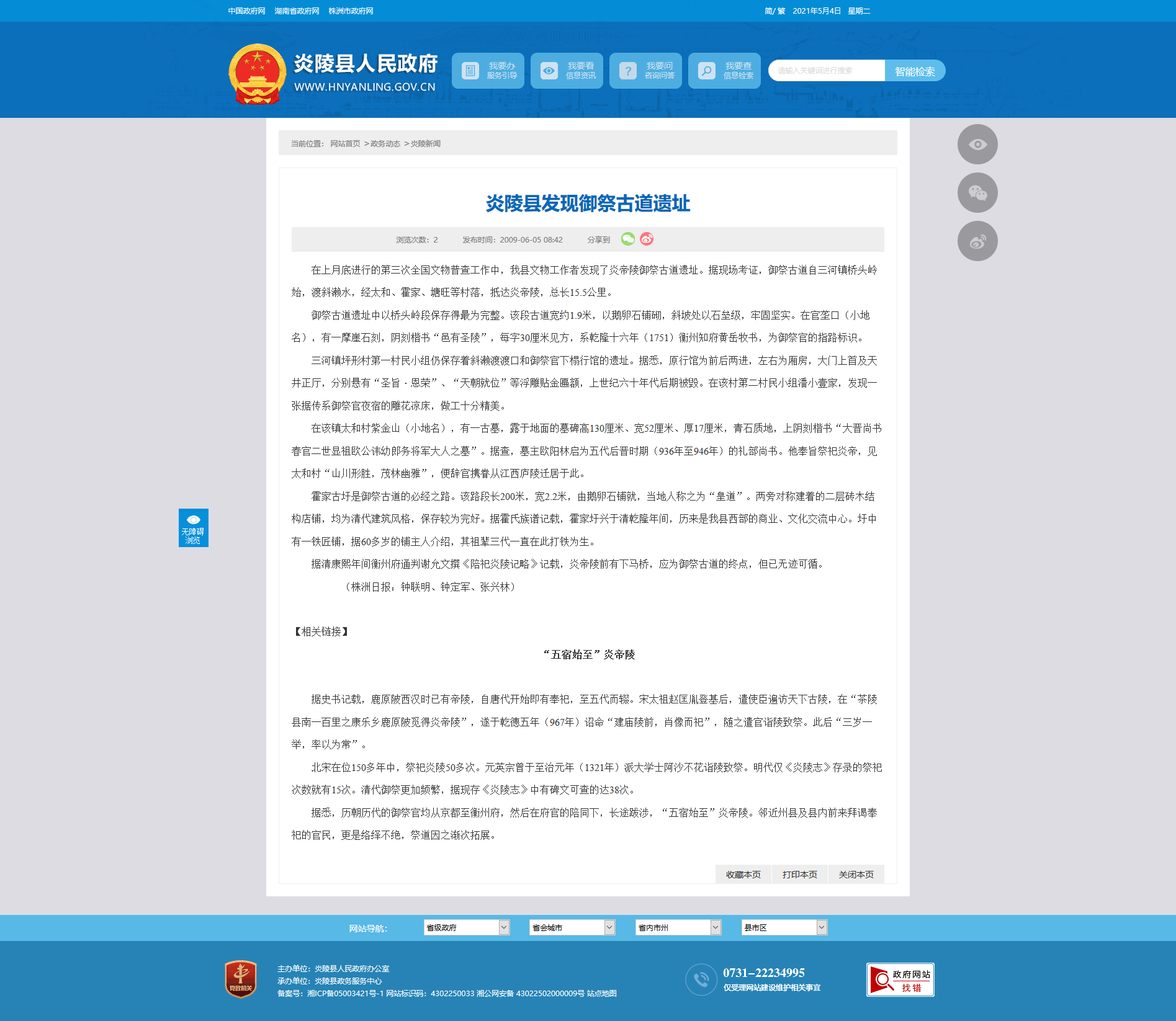 在上月底进行的第三次全国文物普查工作中,我县文物工作者发现了炎帝陵御祭古道遗址。据现场考证,御祭古道自三河镇桥头岭始,渡斜濑水,经太和、霍家、塘旺等村落,抵达炎帝陵,总长15.5公里。