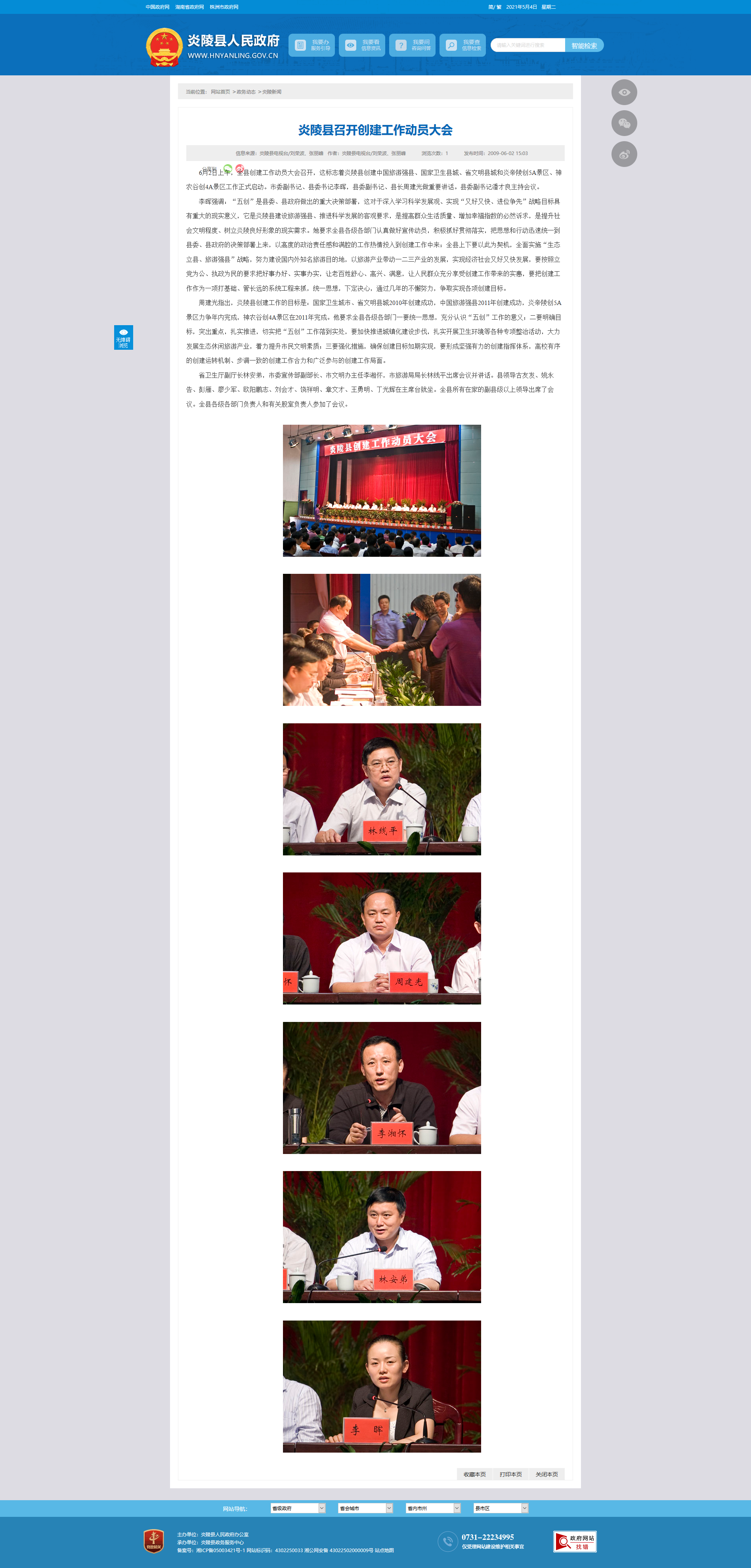 周建光指出,炎陵县创建工作的目标是:国家卫生城市、省文明县城2010年创建成功,中国旅游强县2011年创建成功,炎帝陵创5A景区力争年内完成,神农谷创4A景区在2011年完成。他要求全县各级各部门一要统一思想,充分认识“五创”工作的意义;二要明确目标,突出重点,扎实推进,切实把“五创”工作落到实处,要加快推进城镇化建设步伐,扎实开展卫生环境等各种专项整治活动,大力发展生态休闲旅游产业,着力提升市民文明素质;三要强化措施,确保创建目标如期实现,要形成坚强有力的创建指挥体系,高校有序的创建运转机制、步调一致的创建工作合力和广泛参与的创建工作局面。