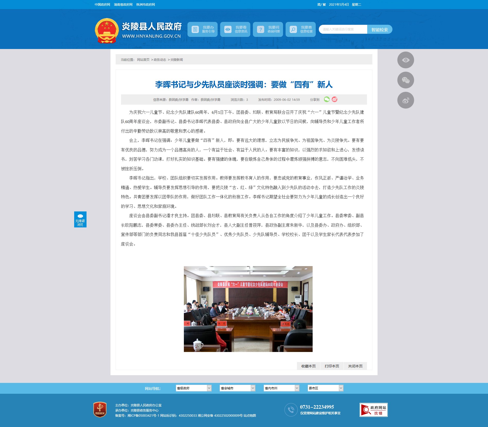为庆祝六一儿童节、纪念少先队建队60周年,6月1日下午,团县委、妇联、教育局联合召开了庆祝“六一”儿童节暨纪念少先队建队60周年座谈会,市委副书记、县委书记李晖代表县委、县政府向全县广大的少年儿童致以节日的问候,向辅导员和少年儿童工作者所付出的辛勤劳动致以崇高的敬意和衷心的感谢。