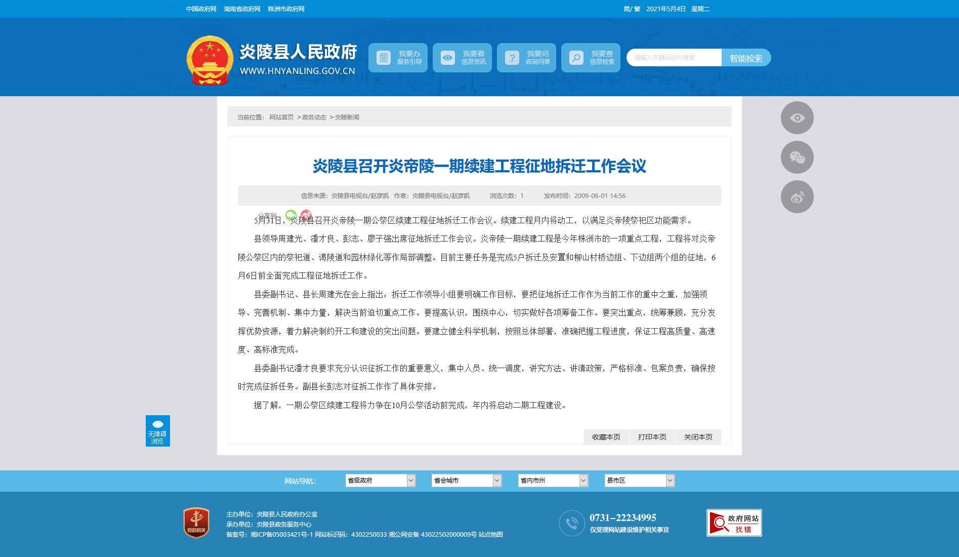 县领导周建光、潘才良、彭志、廖子强出席征地拆迁工作会议。炎帝陵一期续建工程是今年株洲市的一项重点工程,工程将对炎帝陵公祭区内的祭祀道、谒陵道和园林绿化等作局部调整。目前主要任务是完成5户拆迁及安置和柳山村桥边组、下边组两个组的征地,6月6日前全面完成工程征地拆迁工作。
