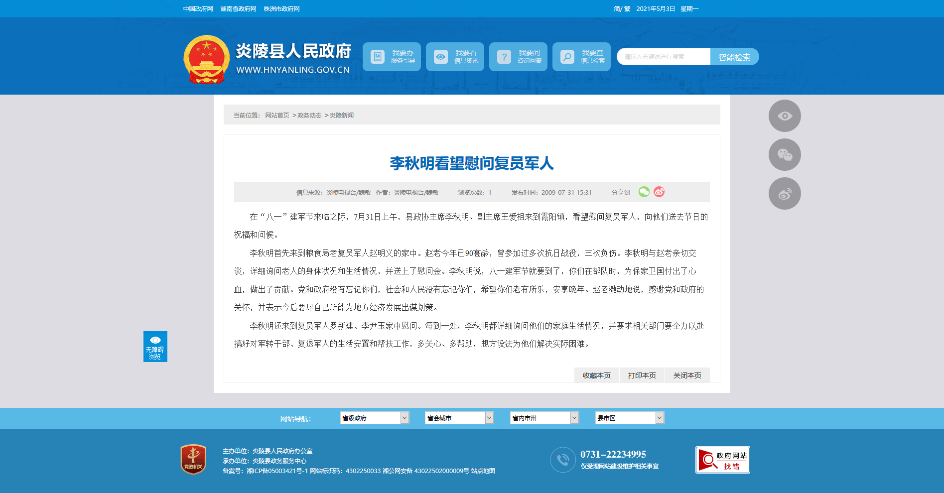 李秋明首先来到粮食局老复员军人赵明义的家中。赵老今年已90高龄,曾参加过多次抗日战役,三次负伤。李秋明与赵老亲切交谈,详细询问老人的身体状况和生活情况,并送上了慰问金。李秋明说,八一建军节就要到了,你们在部队时,为保家卫国付出了心血,做出了贡献。党和政府没有忘记你们,社会和人民没有忘记你们,希望你们老有所乐,安享晚年。赵老激动地说,感谢党和政府的关怀,并表示今后要尽自己所能为地方经济发展出谋划策。