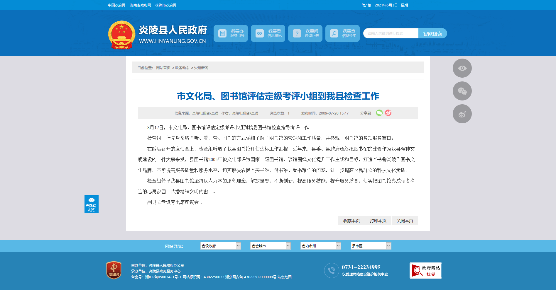 在随后召开的座谈会上,检查组听取了我县图书馆评估达标工作汇报,近年来,县委、县政府始终把图书馆的建设作为我县精神文明建设的一件大事来抓,县图书馆2005年被文化部评为国家一级图书馆,该馆围绕文化提升工作主线和目标,打造“书香炎陵”图书文化品牌,不断提高服务质量和服务水平,切实解决农民“买书难、借书难、看书难”的问题,进一步提高农民群众的科技文化素质。