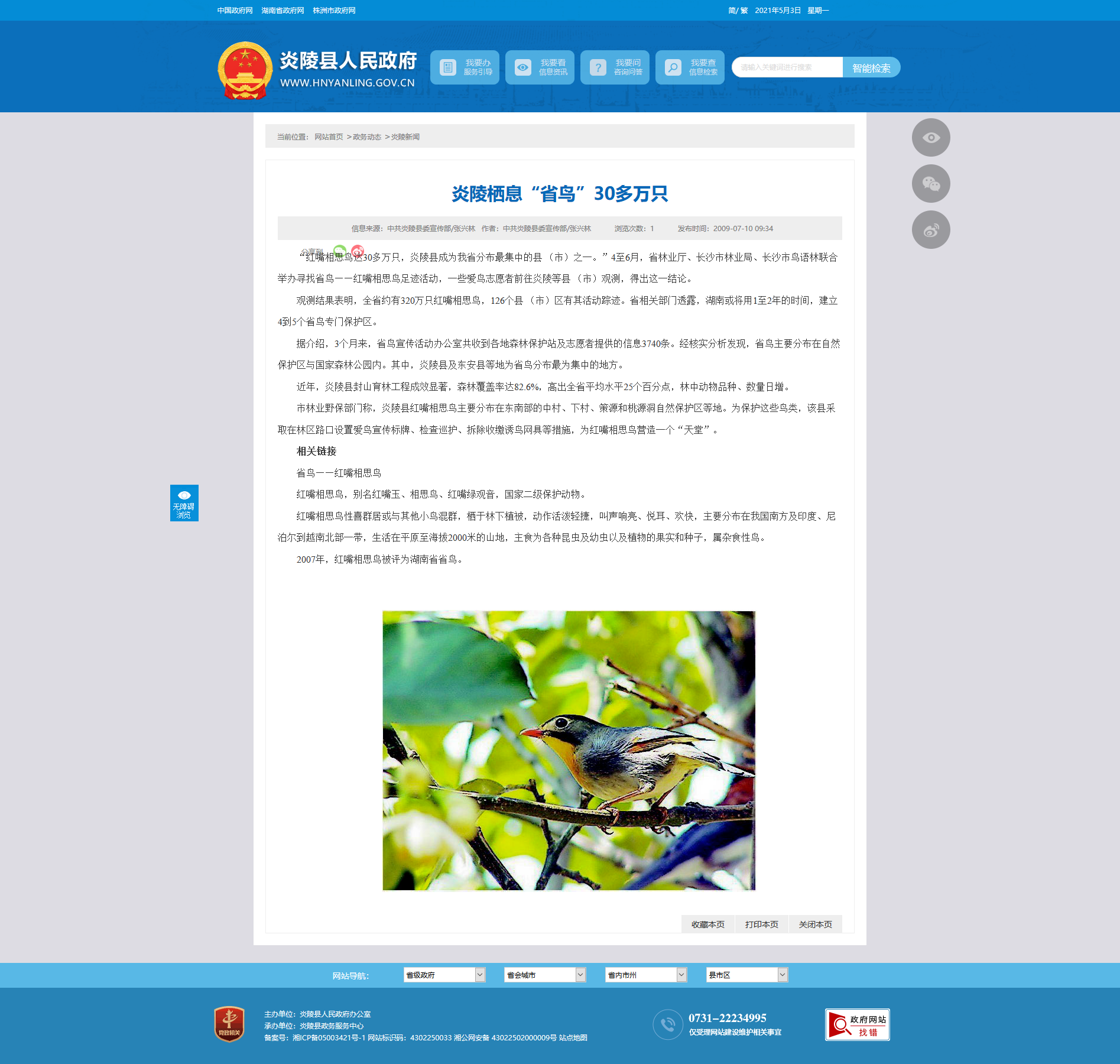 “红嘴相思鸟达30多万只,炎陵县成为我省分布最集中的县 (市)之一。”4至6月,省林业厅、长沙市林业局、长沙市鸟语林联合举办寻找省鸟——红嘴相思鸟足迹活动,一些爱鸟志愿者前往炎陵等县 (市)观测,得出这一结论。
