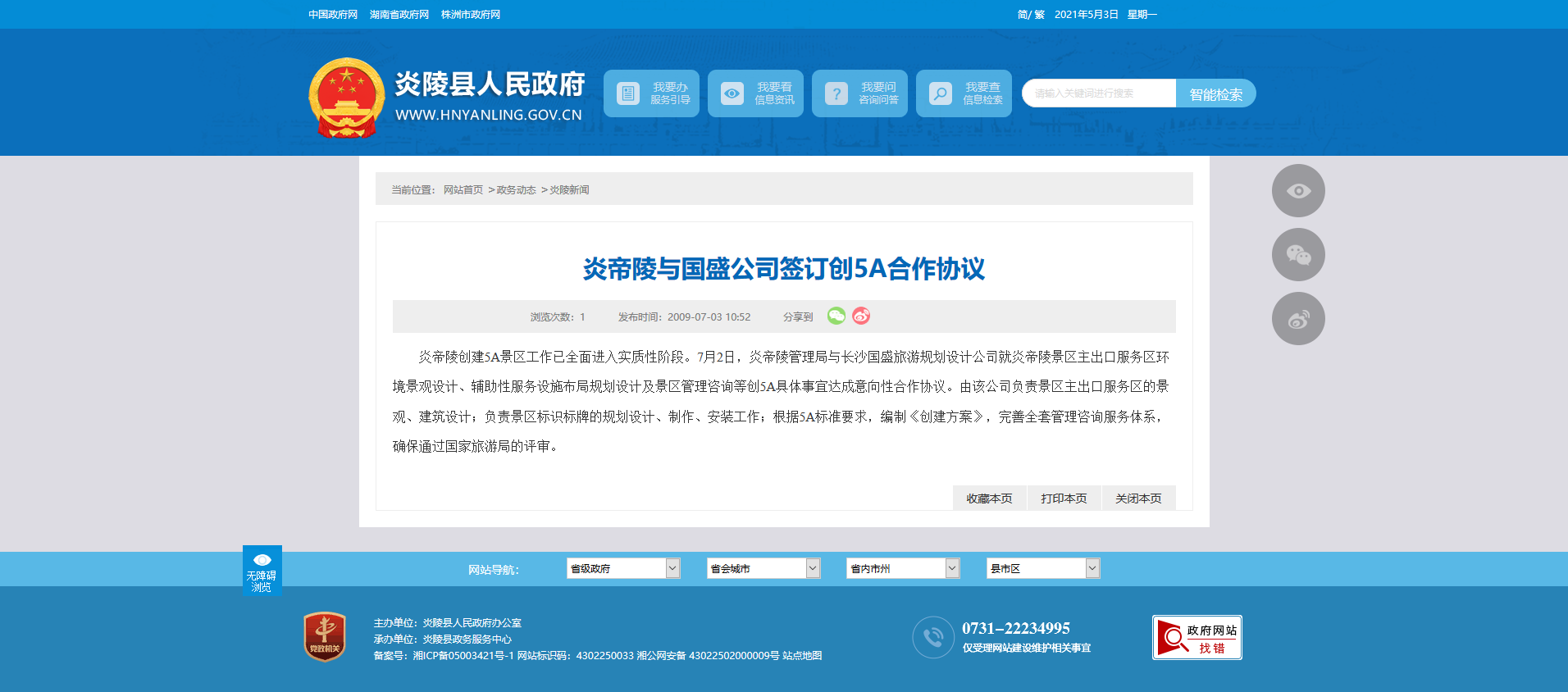 炎帝陵创建5A景区工作已全面进入实质性阶段。7月2日,炎帝陵管理局与长沙国盛旅游规划设计公司就炎帝陵景区主出口服务区环境景观设计、辅助性服务设施布局规划设计及景区管理咨询等创5A具体事宜达成意向性合作协议。由该公司负责景区主出口服务区的景观、建筑设计;负责景区标识标牌的规划设计、制作、安装工作;根据5A标准要求,编制《创建方案》,完善全套管理咨询服务体系,确保通过国家旅游局的评审。
