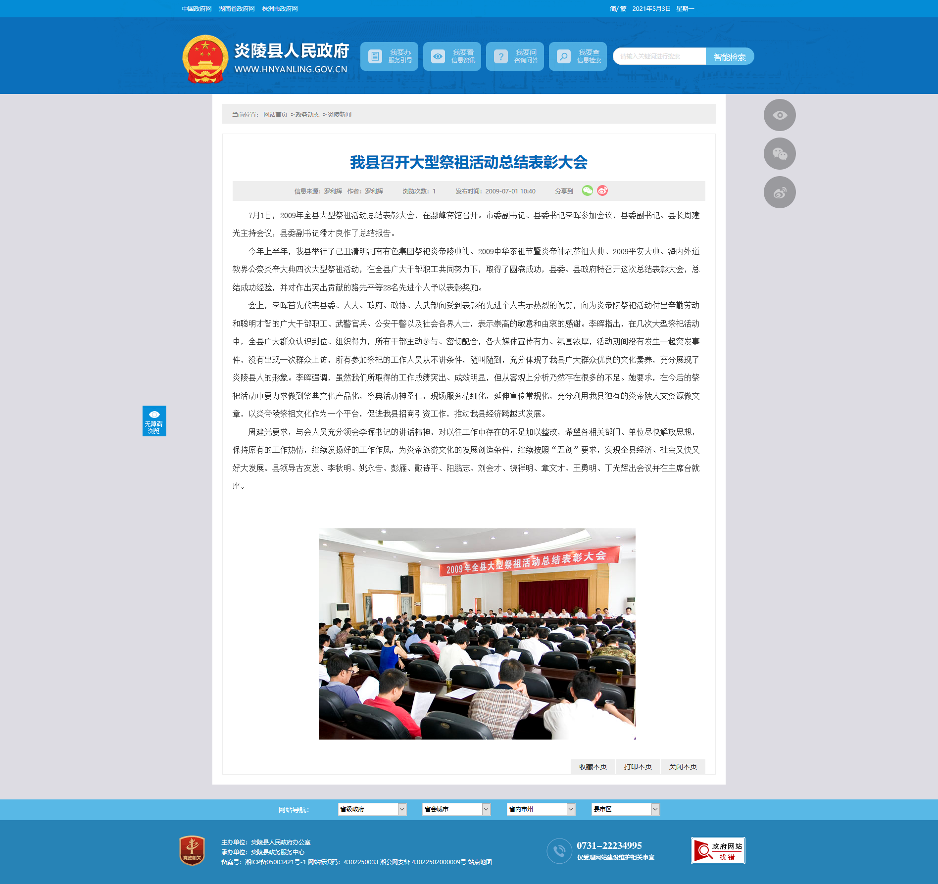 今年上半年,我县举行了已丑清明湖南有色集团祭祀炎帝陵典礼、2009中华茶祖节暨炎帝神农茶祖大典、2009平安大典、海内外道教界公祭炎帝大典四次大型祭祖活动,在全县广大干部职工共同努力下,取得了圆满成功,县委、县政府特召开这次总结表彰大会,总结成功经验,并对作出突出贡献的骆先平等28名先进个人予以表彰奖励。