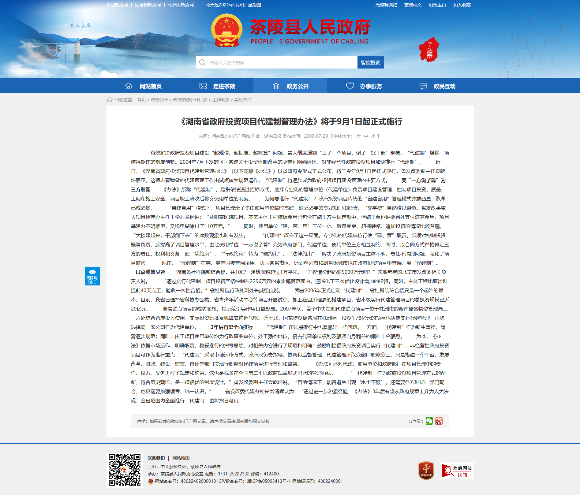 有效解决政府投资项目建设“超规模、超标准、超概算”问题,最大限度遏制“上了一个项目,倒了一批干部”现象,“代建制”堪称一项值得期许的制度创新。2004年7月下发的《国务院关于投资体制改革的决定》明确提出,对非经营性政府投资项目加快推行“代建制”。 近日,《湖南省政府投资项目代建制管理办法》(以下简称《办法》)以省政府令形式正式公布,将于今年9月1日起正式施行。省发改委副主任袁乾培表示,这标志着我省的代建管理工作由试点转为规范运作,“代建制”将逐步成为政府投资项目建设管理的主要方式。 变“一方说了算”为三方制衡 《办法》所称“代建制”,是指依法通过招标方式,选择专业化的管理单位(代建单位)负责项目建设管理,控制项目投资、质量、工期和施工安全,项目竣工验收后移交使用单位的制度。 为何要推行“代建制”?政府投资项目传统的“自建自用”管理模式弊端凸显,改革已成必然。 “自建自用”模式下,项目管理班子多由使用单位临时搭建,缺乏必要的专业知识和经验,“交学费”自然难以避免。省发改委重大项目稽察办主任王学力举例说:“益阳某医院项目,本来主体工程模板费用已包含在施工方中标定额中,但施工单位说要另外支付这笔费用,项目基建办不明就里,又稀里糊涂付了110万元。” 同时,使用单位“建、管、用”三位一体,随意变更、超标装修、追加投资的情况比较普遍,“大楼建起来,干部倒下去”的腐败现象也时有发生。 “代建制”改变了这一局面。专业化的代建单位行使“建、管”职责,必须对控制投资概算负责,这提高了项目管理水平,也让使用单位“一方说了算”变为政府部门、代建单位、使用单位三方相互制约。同时,以合同方式严格界定三方的责任、权利和义务,使“软约束”、“行政约束”转为“硬约束”、“法律约束”,解决了政府投资项目主体不明、责任不清的问题,强化了项目监管。 现在,“代建制”在英、美等国被普遍采用,我国各省市区、计划单列市和副省级城市也在政府投资项目中普遍开展“代建制”。 试点成效显著 湖南省社科院新综合楼,共10层,建筑面积超过1万平米。“工程造价起码要5000万元吧?”来湘考察的北京市发改委相关负责人说。 “通过实行代建制,项目投资严格控制在2296万元的审定概算范围内,还消化了三次优化设计增加的投资。同时,主体工程比原计划提前40天完工,验收一次性合格。”省社科院行政处副处长戚祖良说。 我省2006年正式启动“代建制”,省社科院综合楼只是一个起始的标本。目前,我省已选择省科协办公楼、省青少年活动中心等项目开展试点,加上在四川理县的援建项目,省本级实行代建管理项目的总投资规模已近20亿元。 随着试点项目的成功实施,其示范引导作用日益彰显。2007年底,首个中央在湘代建试点项目――位于株洲市的湖南储备物资管理局三三六处综合仓库投入使用,实际投资比批复概算节约近10%。鉴于此,国家物资储备局在株洲另一投资1.78亿元的项目也决定实行代建管理,再次选择同一家公司作为代建单位。 3年后有望全面推行 “代建制”在试点推行中也暴露出一些问题。一方面,“代建制”作为新生事物,尚需逐步规范;同时,由于项目使用单位均为行政事业单位,处于强势地位,侵占代建单位权利及强调自身利益的倾向十分强烈。 为此,《办法》依据市场运作、明确职责、稳妥推行的指导思想,对相关内容进行了规范和明确:鼓励和提倡政府投资项目实行“代建制”,非经营性政府投资项目可作为推行重点;“代建制”采取市场运作方式,政府只负责指导、协调和监督管理;代建管理不改变部门职能分工,只是搭建一个平台,发展改革、财政、建设、监察、审计等部门按现行职能对代建项目进行管理和监督。 《办法》还对代建、使用单位和政府部门在项目管理中的责任、权力、义务进行了规定和约束。这也是我省在全国第二个以政府规章形式出台的管理办法。 “‘代建制’作为政府投资项目管理方式的创新,符合历史潮流,是一项很优的制度设计。”省发改委副主任袁乾培说,“目前情况下,能否避免出现‘水土不服’,还需要各方呵护、部门配合,也更需要加强领导、统一认识。” 省发改委代建办处长彭清辉认为:“通过进一步积累经验,《办法》3年后有望从政府规章上升为人大法规,全省范围内全面推行‘代建制’也将指日可待。”