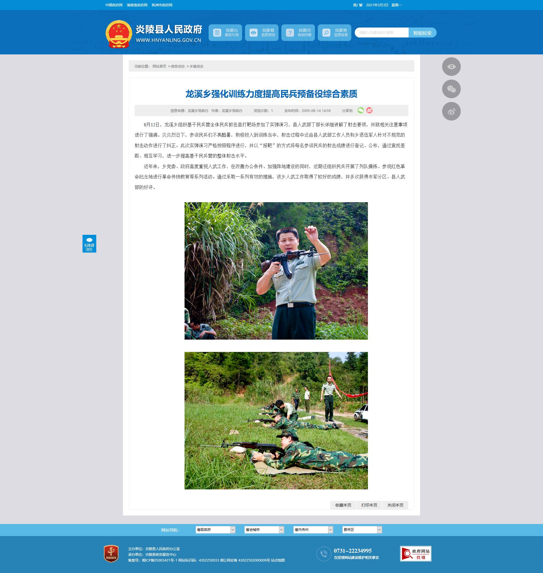 近年来,乡党委、政府高度重视人武工作,在改善办公条件、加强阵地建设的同时,近期还组织民兵开展了列队操练、参观红色革命纪念地进行革命传统教育等系列活动。通过采取一系列有效的措施,该乡人武工作取得了较好的成绩,并多次获得市军分区、县人武部的好评。