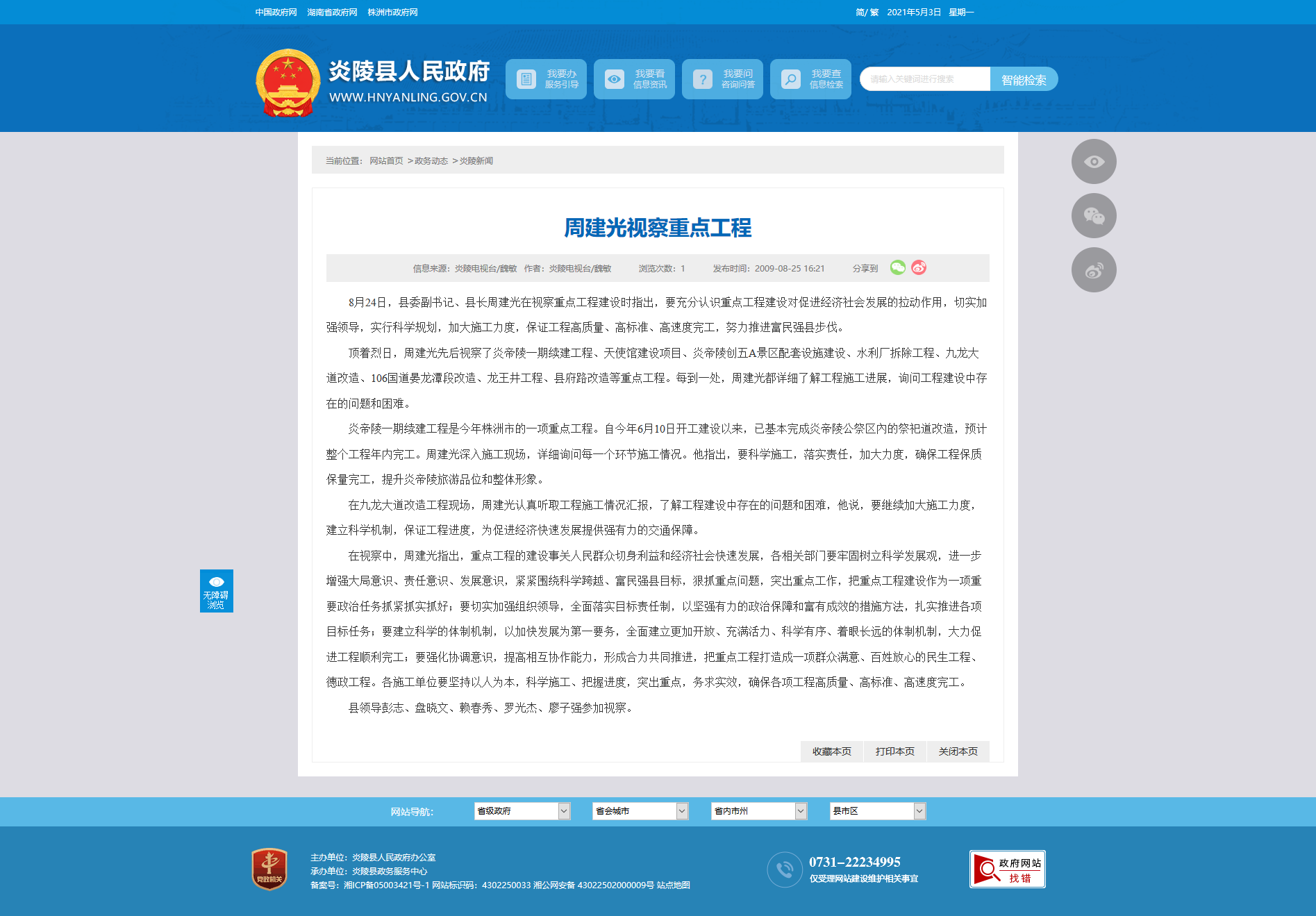 炎帝陵一期续建工程是今年株洲市的一项重点工程。自今年6月10日开工建设以来,已基本完成炎帝陵公祭区內的祭祀道改造,预计整个工程年内完工。周建光深入施工现场,详细询问每一个环节施工情况。他指出,要科学施工,落实责任,加大力度,确保工程保质保量完工,提升炎帝陵旅游品位和整体形象。