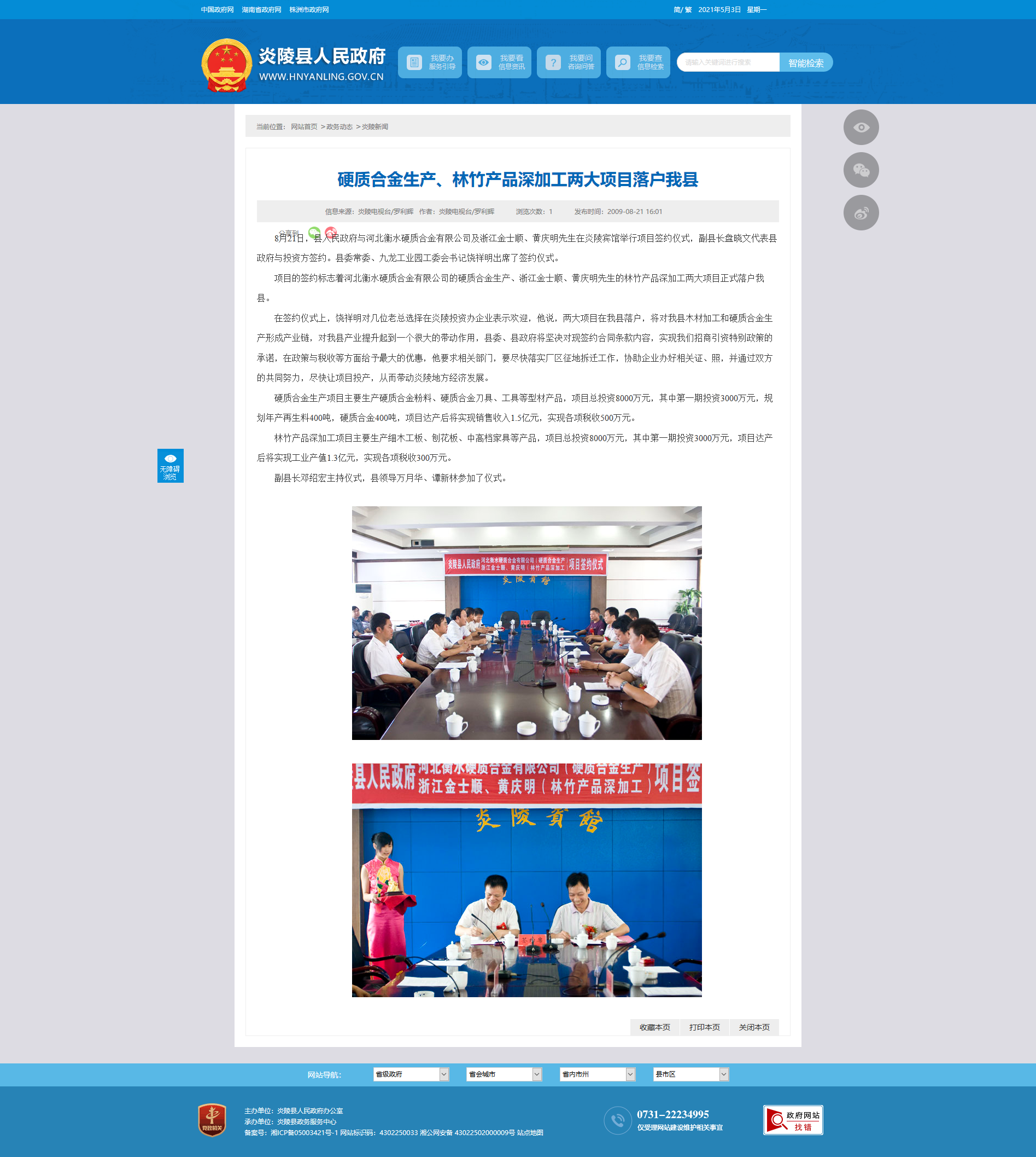 在签约仪式上,饶祥明对几位老总选择在炎陵投资办企业表示欢迎,他说,两大项目在我县落户,将对我县木材加工和硬质合金生产形成产业链,对我县产业提升起到一个很大的带动作用,县委、县政府将坚决对现签约合同条款内容,实现我们招商引资特别政策的承诺,在政策与税收等方面给予最大的优惠,他要求相关部门,要尽快落实厂区征地拆迁工作,协助企业办好相关证、照,并通过双方的共同努力,尽快让项目投产,从而带动炎陵地方经济发展。