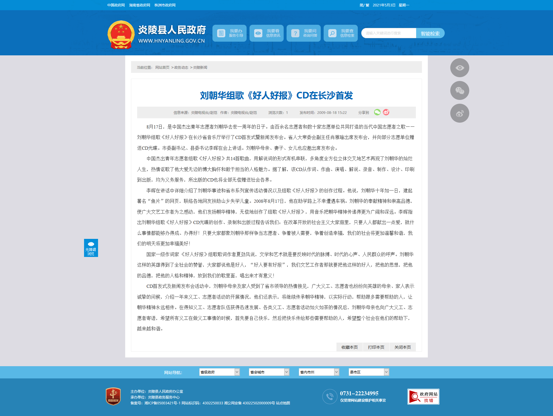 CD首发式及新闻发布会活动中,刘朝华母亲及家人受到了省市领导的热情接见,广大义工、志愿者也纷纷向英雄的母亲、家人表示诚挚的问候,介绍一年来义工、志愿者活动的开展情况,他们还表示,将继续传承朝华精神,以实际行动,帮助跟多需要帮助的人,让朝华精神永远相传。在得知义工、志愿者队伍获得迅速发展、各类义工、志愿者活动如火如荼的情况后,刘朝华母亲也向广大义工、志愿者寄语,希望所有义工在做义工事情的时候,首先要自己快乐,然后把快乐传给那些需要帮助的人,希望整个社会在他们的帮助下,越来越和谐。