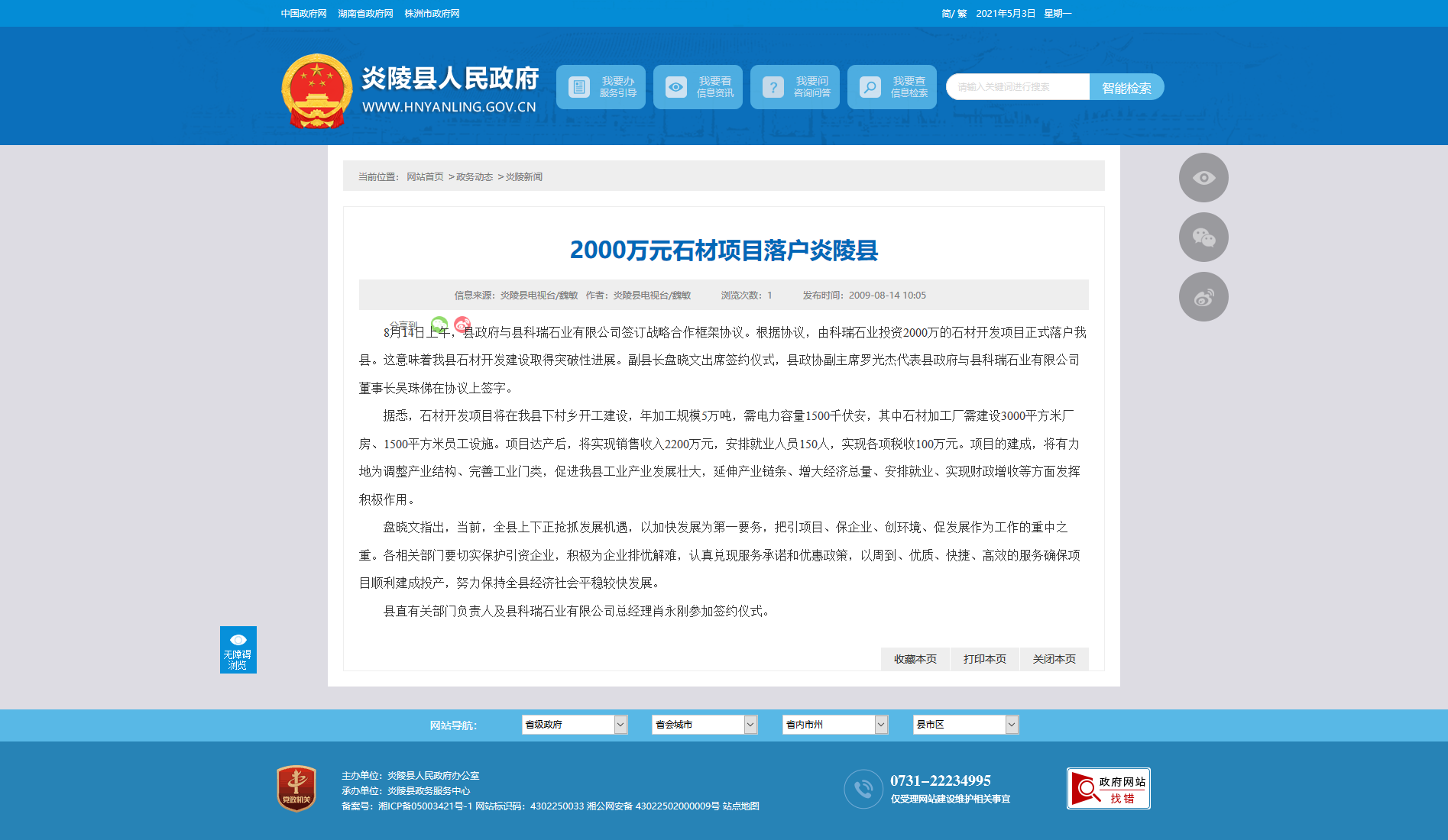 据悉,石材开发项目将在我县下村乡开工建设,年加工规模5万吨,需电力容量1500千伏安,其中石材加工厂需建设3000平方米厂房、1500平方米员工设施。项目达产后,将实现销售收入2200万元,安排就业人员150人,实现各项税收100万元。项目的建成,将有力地为调整产业结构、完善工业门类,促进我县工业产业发展壮大,延伸产业链条、增大经济总量、安排就业、实现财政增收等方面发挥积极作用。