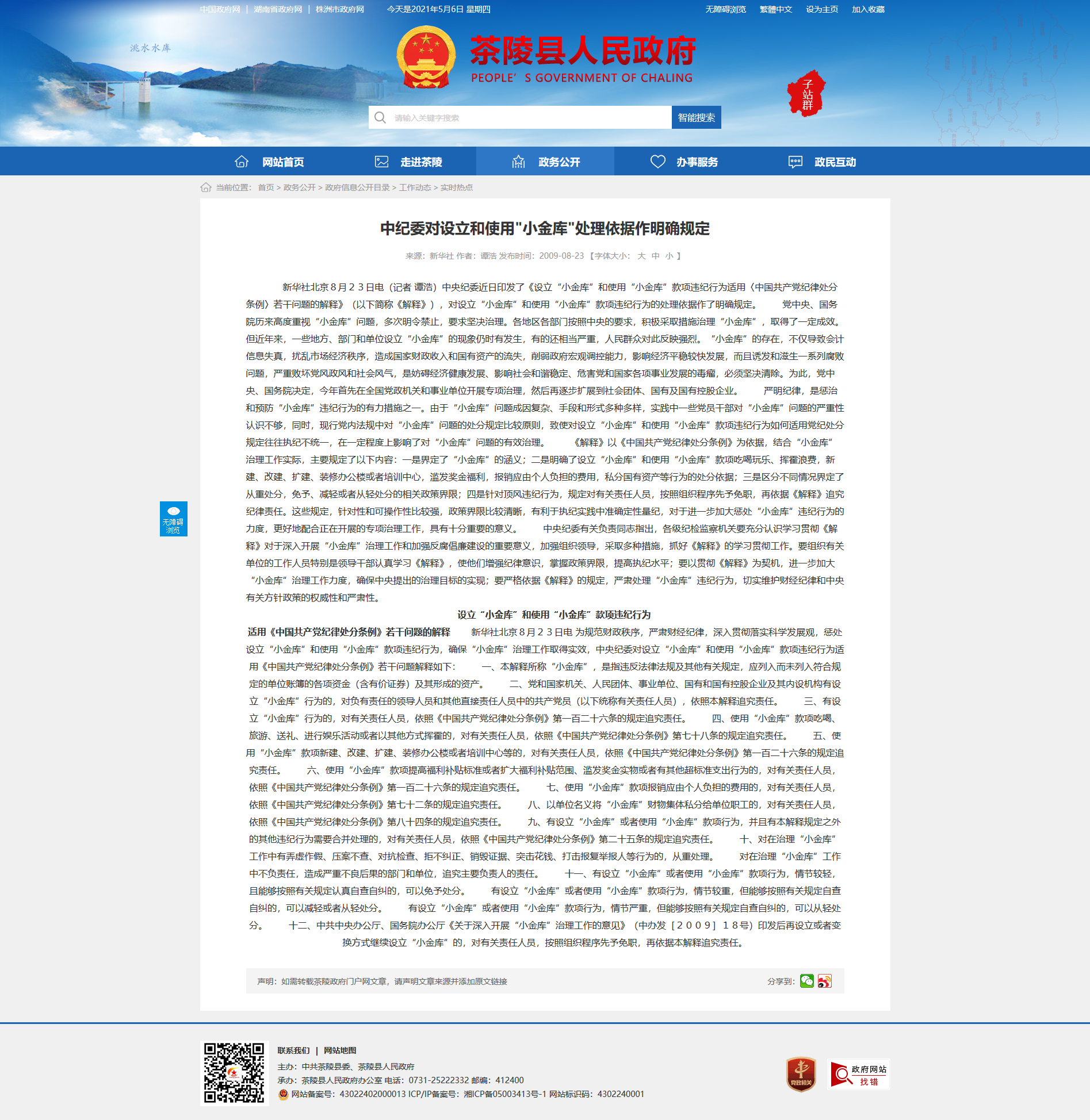 适用《中国共产党纪律处分条例》若干问题的解释 新华社北京8月23日电 为规范财政秩序,严肃财经纪律,深入贯彻落实科学发展观,惩处设立“小金库”和使用“小金库”款项违纪行为,确保“小金库”治理工作取得实效,中央纪委对设立“小金库”和使用“小金库”款项违纪行为适用《中国共产党纪律处分条例》若干问题解释如下: 一、本解释所称“小金库”,是指违反法律法规及其他有关规定,应列入而未列入符合规定的单位账簿的各项资金(含有价证券)及其形成的资产。 二、党和国家机关、人民团体、事业单位、国有和国有控股企业及其内设机构有设立“小金库”行为的,对负有责任的领导人员和其他直接责任人员中的共产党员(以下统称有关责任人员),依照本解释追究责任。 三、有设立“小金库”行为的,对有关责任人员,依照《中国共产党纪律处分条例》第一百二十六条的规定追究责任。 四、使用“小金库”款项吃喝、旅游、送礼、进行娱乐活动或者以其他方式挥霍的,对有关责任人员,依照《中国共产党纪律处分条例》第七十八条的规定追究责任。 五、使用“小金库”款项新建、改建、扩建、装修办公楼或者培训中心等的,对有关责任人员,依照《中国共产党纪律处分条例》第一百二十六条的规定追究责任。 六、使用“小金库”款项提高福利补贴标准或者扩大福利补贴范围、滥发奖金实物或者有其他超标准支出行为的,对有关责任人员,依照《中国共产党纪律处分条例》第一百二十六条的规定追究责任。 七、使用“小金库”款项报销应由个人负担的费用的,对有关责任人员,依照《中国共产党纪律处分条例》第七十二条的规定追究责任。 八、以单位名义将“小金库”财物集体私分给单位职工的,对有关责任人员,依照《中国共产党纪律处分条例》第八十四条的规定追究责任。 九、有设立“小金库”或者使用“小金库”款项行为,并且有本解释规定之外的其他违纪行为需要合并处理的,对有关责任人员,依照《中国共产党纪律处分条例》第二十五条的规定追究责任。 十、对在治理“小金库”工作中有弄虚作假、压案不查、对抗检查、拒不纠正、销毁证据、突击花钱、打击报复举报人等行为的,从重处理。 对在治理“小金库”工作中不负责任,造成严重不良后果的部门和单位,追究主要负责人的责任。 十一、有设立“小金库”或者使用“小金库”款项行为,情节较轻,且能够按照有关规定认真自查自纠的,可以免予处分。 有设立“小金库”或者使用“小金库”款项行为,情节较重,但能够按照有关规定自查自纠的,可以减轻或者从轻处分。 有设立“小金库”或者使用“小金库”款项行为,情节严重,但能够按照有关规定自查自纠的,可以从轻处分。 十二、中共中央办公厅、国务院办公厅《关于深入开展“小金库”治理工作的意见》(中办发[2009]18号)印发后再设立或者变换方式继续设立“小金库”的,对有关责任人员,按照组织程序先予免职,再依据本解释追究责任。