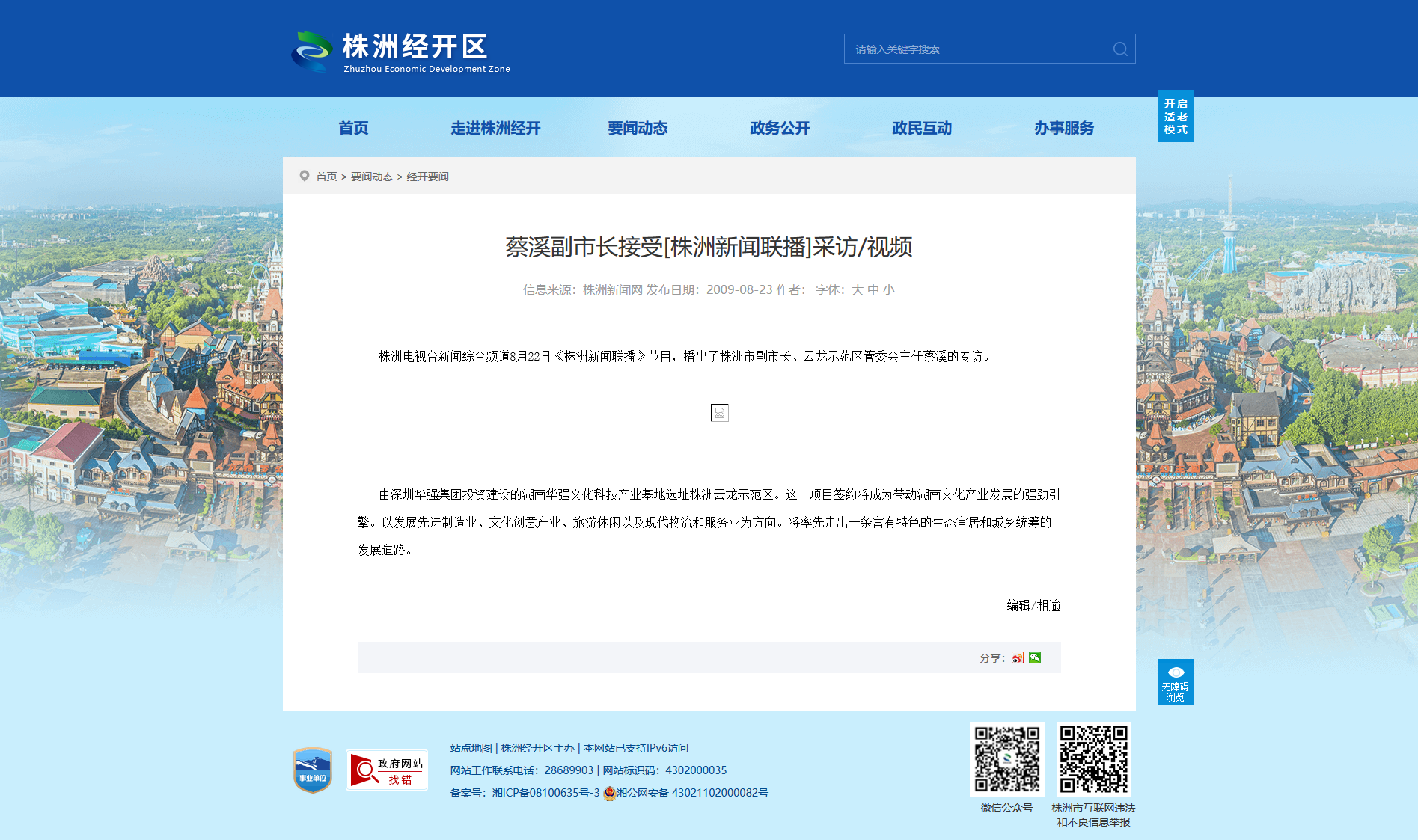 株洲电视台新闻综合频道8月22日《株洲新闻联播》节目,播出了株洲市副市长、云龙示范区管委会主任蔡溪的专访。