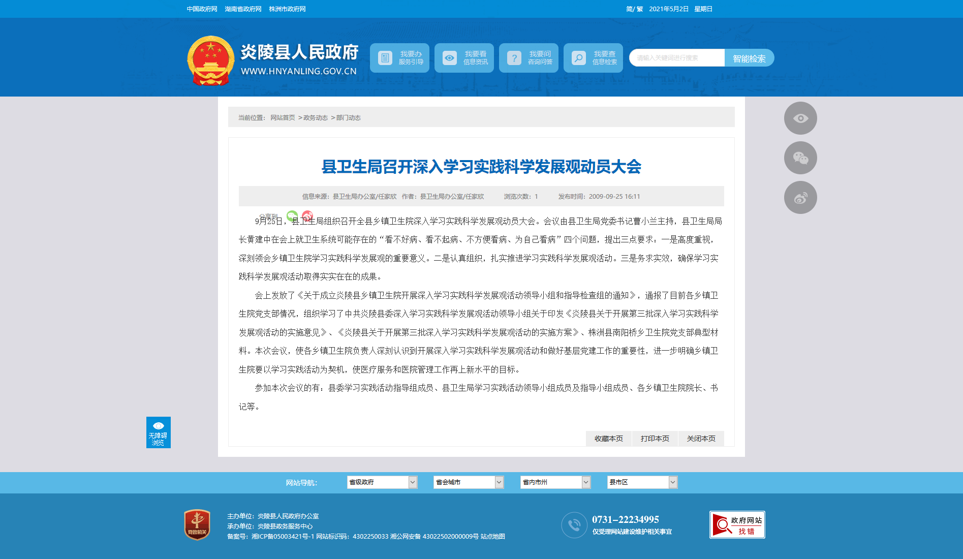 会上发放了《关于成立炎陵县乡镇卫生院开展深入学习实践科学发展观活动领导小组和指导检查组的通知》,通报了目前各乡镇卫生院党支部情况,组织学习了中共炎陵县委深入学习实践科学发展观活动领导小组关于印发《炎陵县关于开展第三批深入学习实践科学发展观活动的实施意见》、《炎陵县关于开展第三批深入学习实践科学发展观活动的实施方案》、株洲县南阳桥乡卫生院党支部典型材料。本次会议,使各乡镇卫生院负责人深刻认识到开展深入学习实践科学发展观活动和做好基层党建工作的重要性,进一步明确乡镇卫生院要以学习实践活动为契机,使医疗服务和医院管理工作再上新水平的目标。
