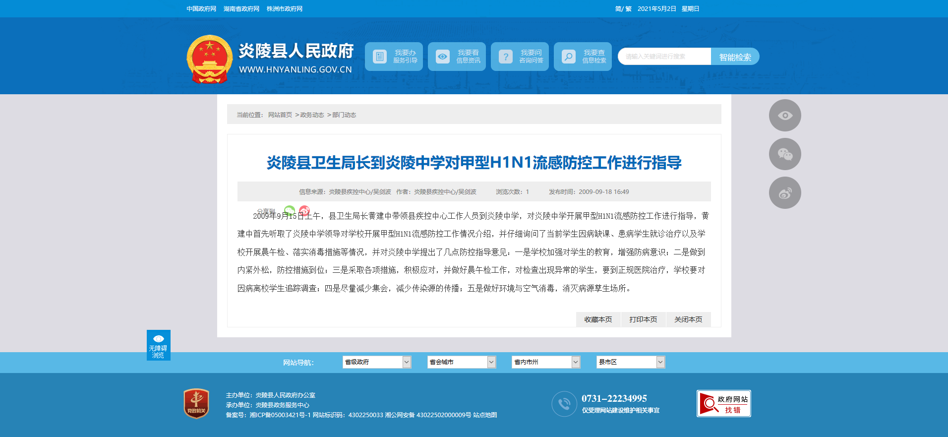 2009年9月15日上午,县卫生局长黄建中带领县疾控中心工作人员到炎陵中学,对炎陵中学开展甲型H1N1流感防控工作进行指导,黄建中首先听取了炎陵中学领导对学校开展甲型H1N1流感防控工作情况介绍,并仔细询问了当前学生因病缺课、患病学生就诊治疗以及学校开展晨午检、落实消毒措施等情况,并对炎陵中学提出了几点防控指导意见:一是学校加强对学生的教育,增强防病意识;二是做到内紧外松,防控措施到位;三是采取各项措施,积极应对,并做好晨午检工作,对检查出现异常的学生,要到正规医院治疗,学校要对因病离校学生追踪调查;四是尽量减少集会,减少传染源的传播;五是做好环境与空气消毒,消灭病源孳生场所。