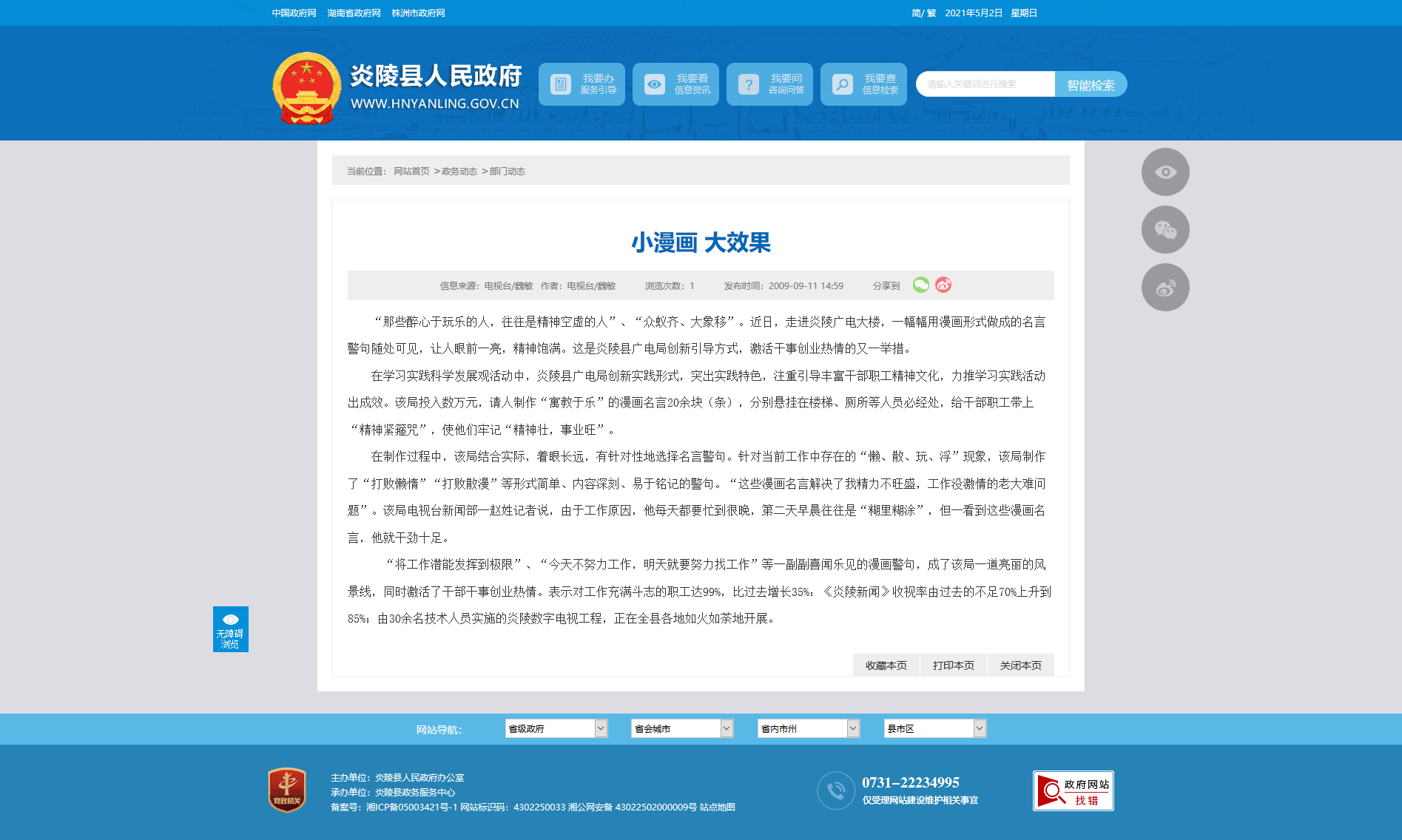 “将工作潜能发挥到极限”、“今天不努力工作,明天就要努力找工作”等一副副喜闻乐见的漫画警句,成了该局一道亮丽的风景线,同时激活了干部干事创业热情。表示对工作充满斗志的职工达99%,比过去增长35%:《炎陵新闻》收视率由过去的不足70%上升到85%;由30余名技术人员实施的炎陵数字电视工程,正在全县各地如火如荼地开展。