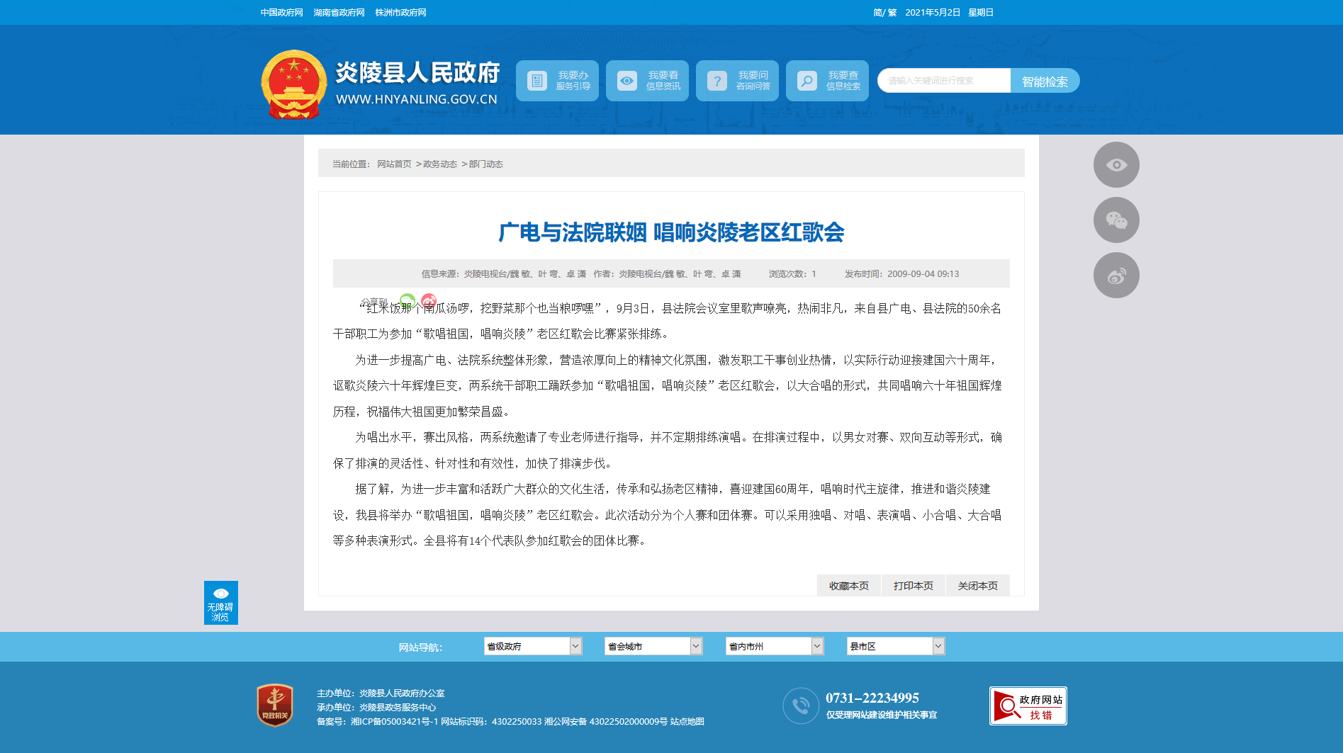 为进一步提高广电、法院系统整体形象,营造浓厚向上的精神文化氛围,激发职工干事创业热情,以实际行动迎接建国六十周年,讴歌炎陵六十年辉煌巨变,两系统干部职工踊跃参加“歌唱祖国,唱响炎陵”老区红歌会,以大合唱的形式,共同唱响六十年祖国辉煌历程,祝福伟大祖国更加繁荣昌盛。