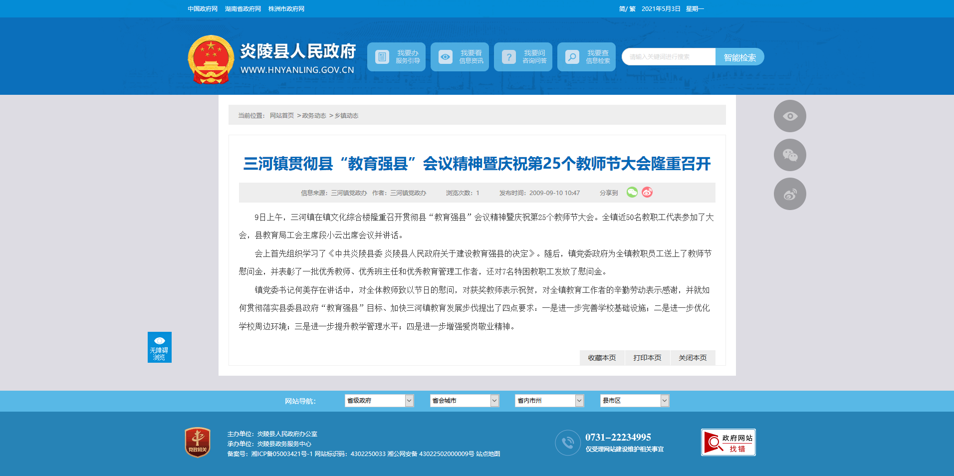 镇党委书记何美存在讲话中,对全体教师致以节日的慰问,对获奖教师表示祝贺,对全镇教育工作者的辛勤劳动表示感谢,并就如何贯彻落实县委县政府“教育强县”目标、加快三河镇教育发展步伐提出了四点要求:一是进一步完善学校基础设施;二是进一步优化学校周边环境;三是进一步提升教学管理水平;四是进一步增强爱岗敬业精神。