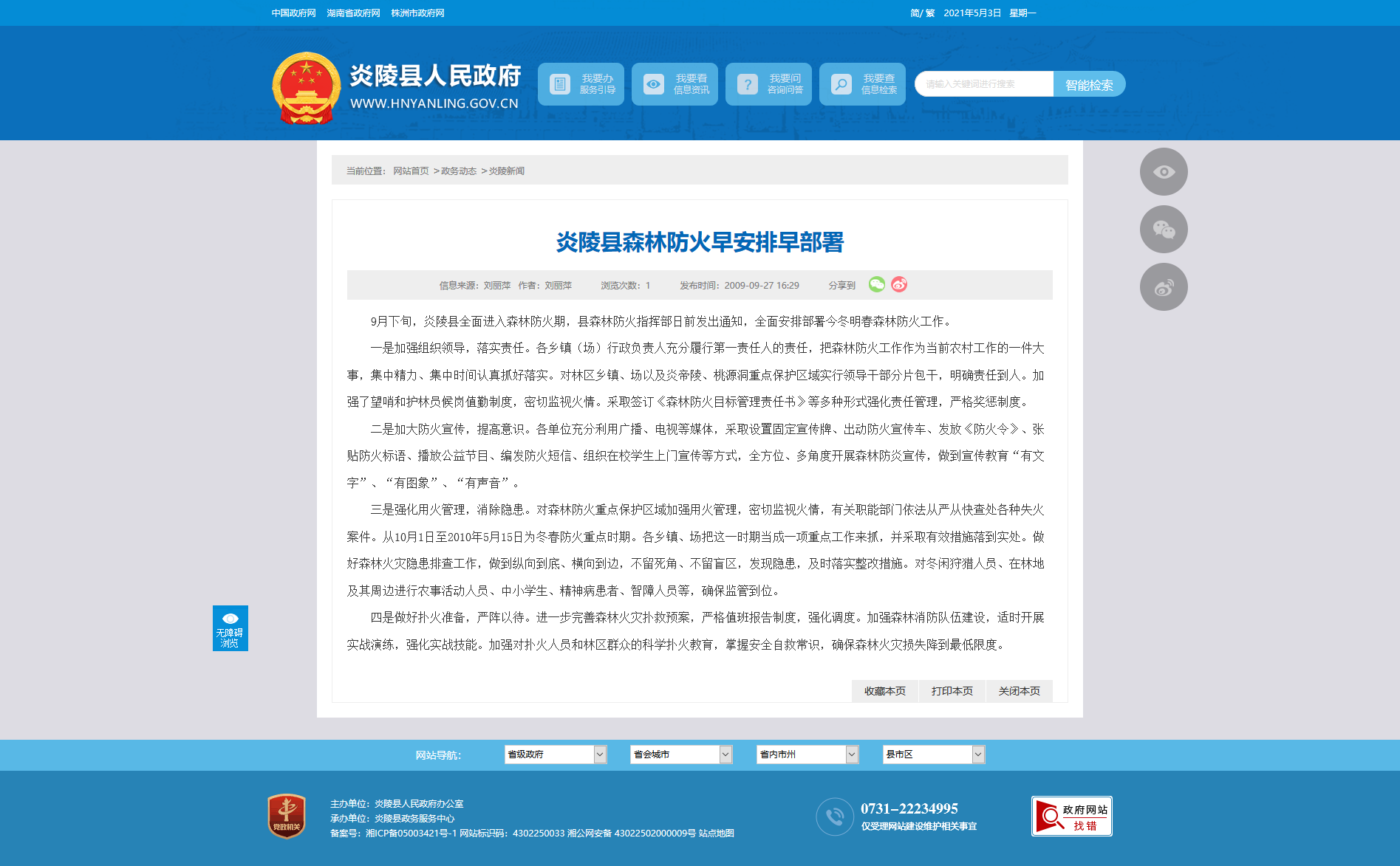 一是加强组织领导,落实责任。各乡镇(场)行政负责人充分履行第一责任人的责任,把森林防火工作作为当前农村工作的一件大事,集中精力、集中时间认真抓好落实。对林区乡镇、场以及炎帝陵、桃源洞重点保护区域实行领导干部分片包干,明确责任到人。加强了望哨和护林员候岗值勤制度,密切监视火情。采取签订《森林防火目标管理责任书》等多种形式强化责任管理,严格奖惩制度。