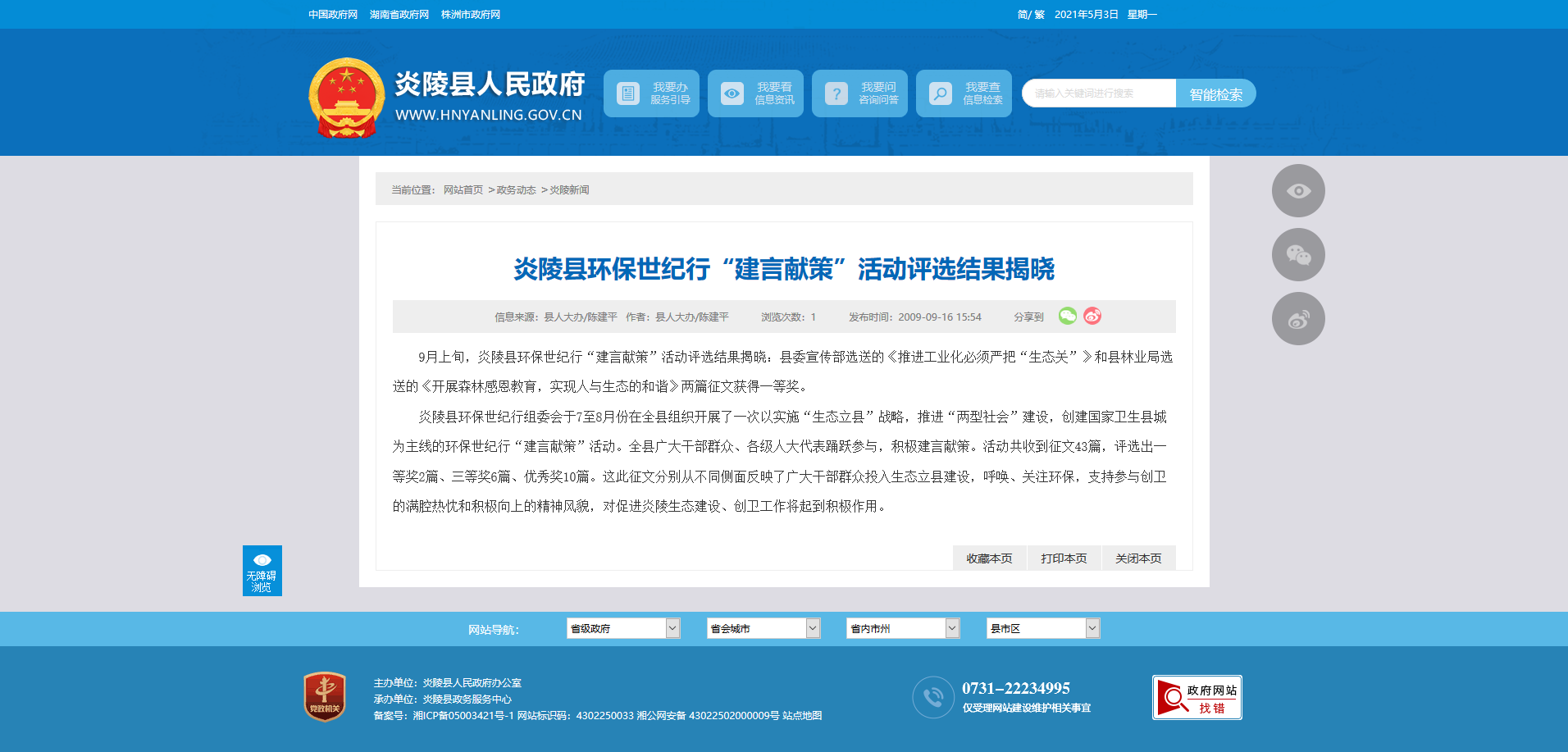 9月上旬,炎陵县环保世纪行“建言献策”活动评选结果揭晓:县委宣传部选送的《推进工业化必须严把“生态关”》和县林业局选送的《开展森林感恩教育,实现人与生态的和谐》两篇征文获得一等奖。