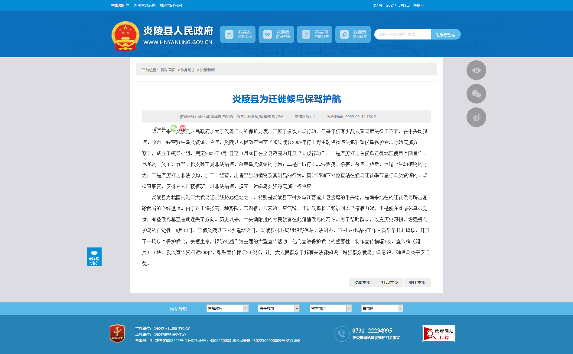 炎陵县为我国内陆三大候鸟迁徒线路必经地之一,特别是炎陵县下村乡与江西遂川县接壤的牛头坳,是南来北往的迁徙候鸟跨越湘赣两省的必经通道。由于这里海拔高、地势险、气温低、云雾浓、空气稀,迁徙候鸟长途跋涉到此已精疲力竭,于是便在此或休息或觅食,有些候鸟甚至在此迷失了方向。历史以来,牛头坳附近的村民就有在此猎捕候鸟的习惯。为了帮助群众,改变历史习惯,增强爱鸟护鸟的自觉性,9月12日,正值炎陵县下村乡逢墟之日,炎陵县林业局组织野保站、法制办、下村林业站的工作人员早早赶赴墟场,开展了一场以“保护候鸟,关爱生命,预防流感”为主题的大型宣传活动。他们宣讲保护候鸟的重要性,制作宣传横幅1条、宣传牌(照片)10块、发放宣传资料近800份、张贴宣传标语20余张,让广大人民群众了解有关法律知识,增强群众爱鸟护鸟意识,确保鸟类平安迁徙。
