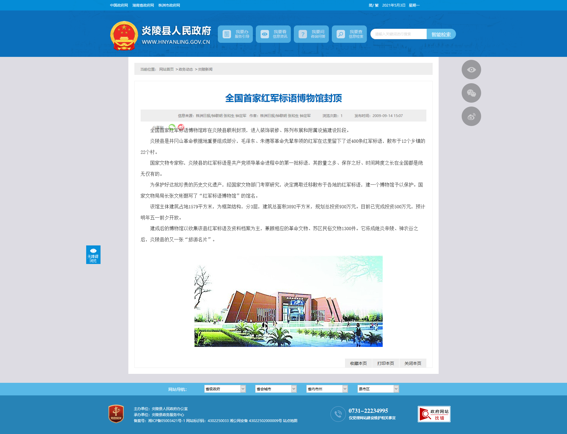 全国首家红军标语博物馆昨在炎陵县顺利封顶,进入装饰装修、陈列布展和附属设施建设阶段。