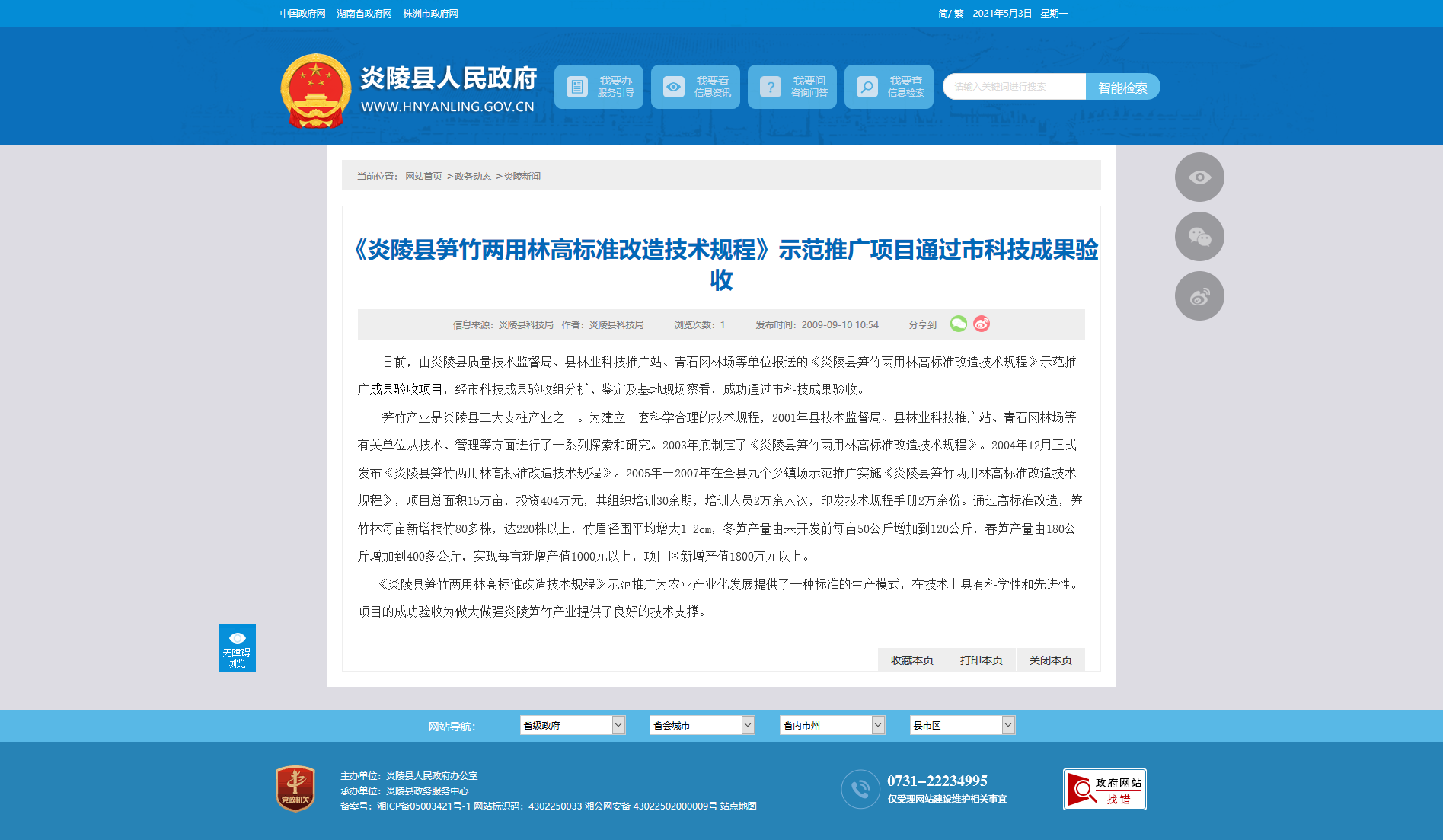 《炎陵县笋竹两用林高标准改造技术规程》示范推广为农业产业化发展提供了一种标准的生产模式,在技术上具有科学性和先进性。项目的成功验收为做大做强炎陵笋竹产业提供了良好的技术支撑。