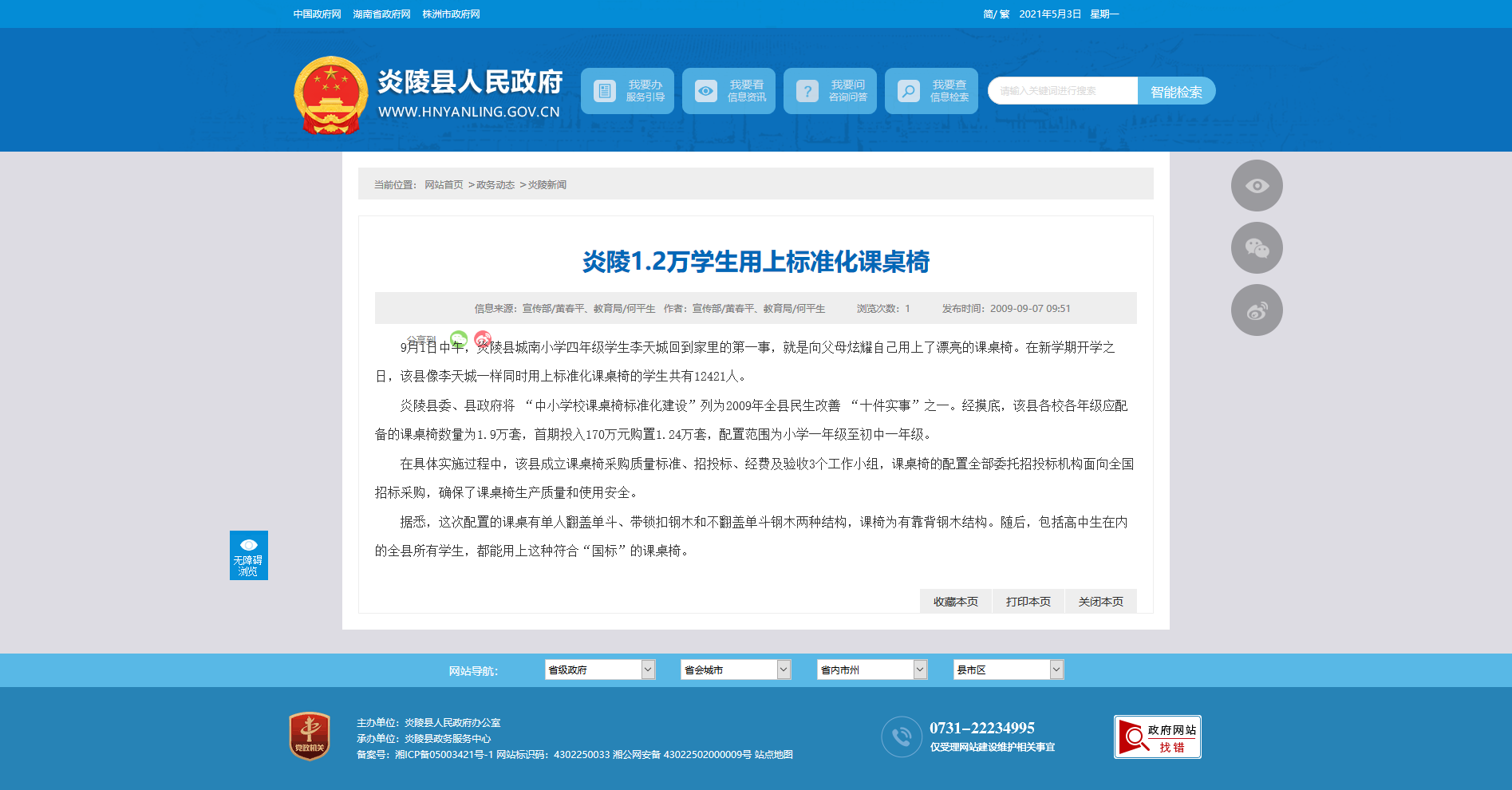 炎陵县委、县政府将 “中小学校课桌椅标准化建设”列为2009年全县民生改善 “十件实事”之一。经摸底,该县各校各年级应配备的课桌椅数量为1.9万套,首期投入170万元购置1.24万套,配置范围为小学一年级至初中一年级。