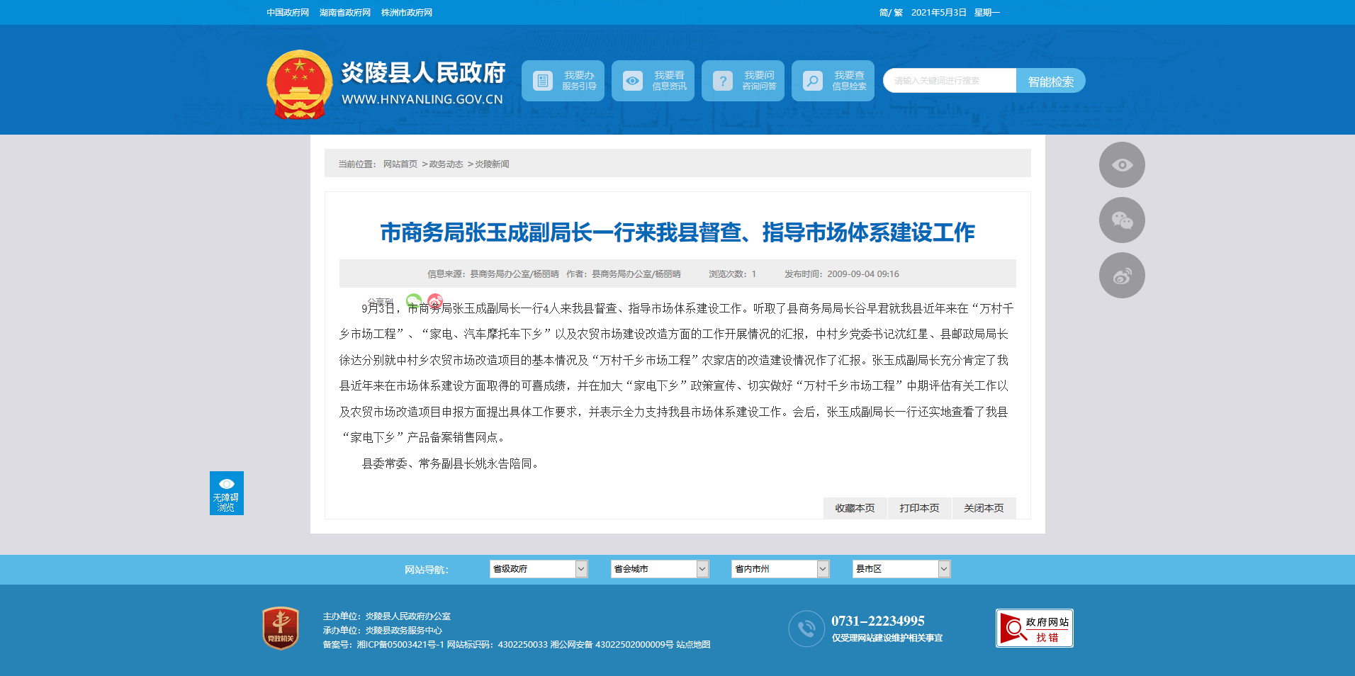 9月3日,市商务局张玉成副局长一行4人来我县督查、指导市场体系建设工作。听取了县商务局局长谷早君就我县近年来在“万村千乡市场工程”、“家电、汽车摩托车下乡”以及农贸市场建设改造方面的工作开展情况的汇报,中村乡党委书记沈红星、县邮政局局长徐达分别就中村乡农贸市场改造项目的基本情况及“万村千乡市场工程”农家店的改造建设情况作了汇报。张玉成副局长充分肯定了我县近年来在市场体系建设方面取得的可喜成绩,并在加大“家电下乡”政策宣传、切实做好“万村千乡市场工程”中期评估有关工作以及农贸市场改造项目申报方面提出具体工作要求,并表示全力支持我县市场体系建设工作。会后,张玉成副局长一行还实地查看了我县“家电下乡”产品备案销售网点。