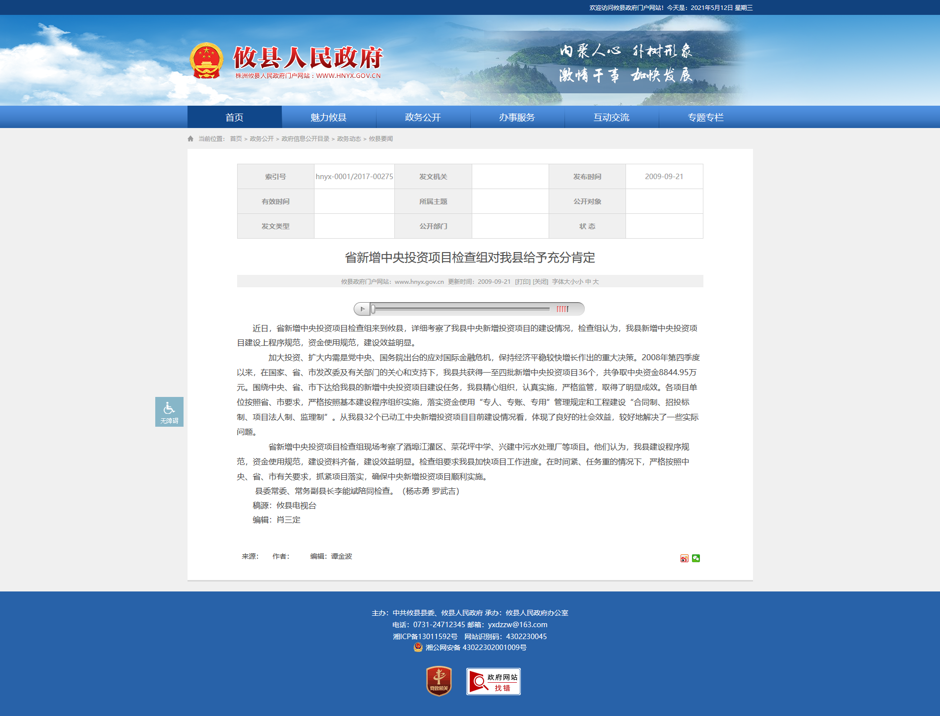 省新增中央投资项目检查组现场考察了酒埠江灌区、菜花坪中学、兴建中污水处理厂等项目。他们认为,我县建设程序规范,资金使用规范,建设资料齐备,建设效益明显。检查组要求我县加快项目工作进度。在时间紧、任务重的情况下,严格按照中央、省、市有关要求,抓紧项目落实,确保中央新增投资项目顺利实施。