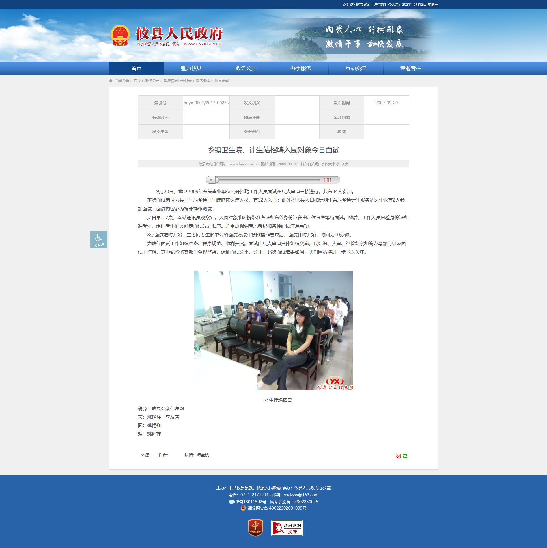 9月20日,我县2009年有关事业单位公开招聘工作人员面试在县人事局三楼进行,共有34人参加。
